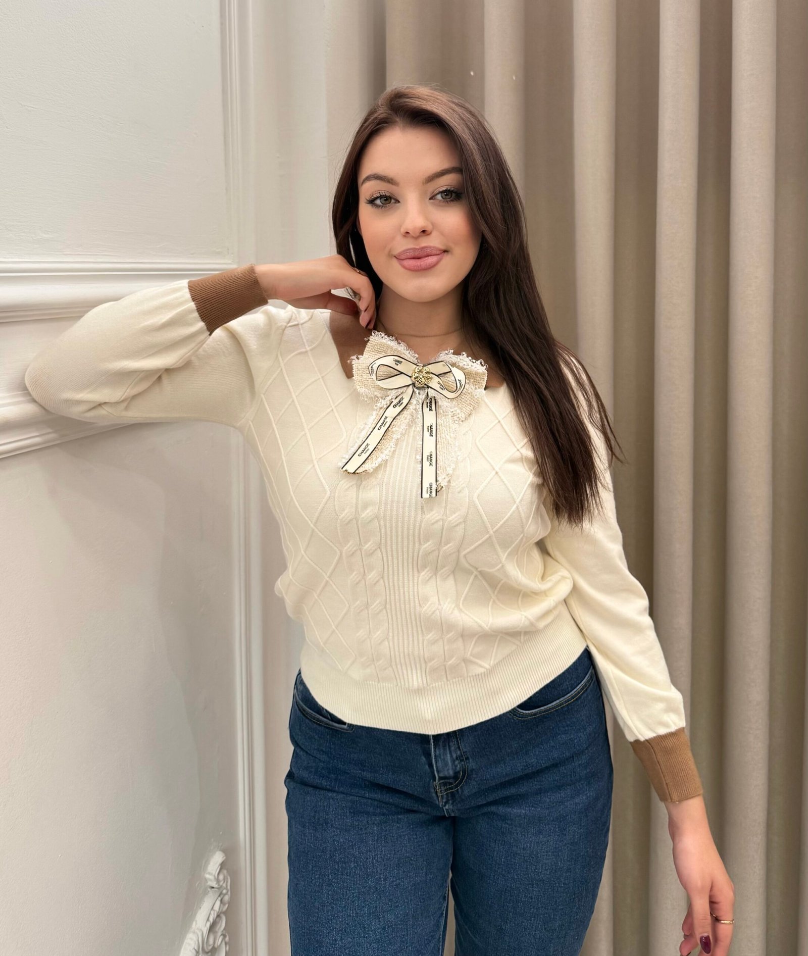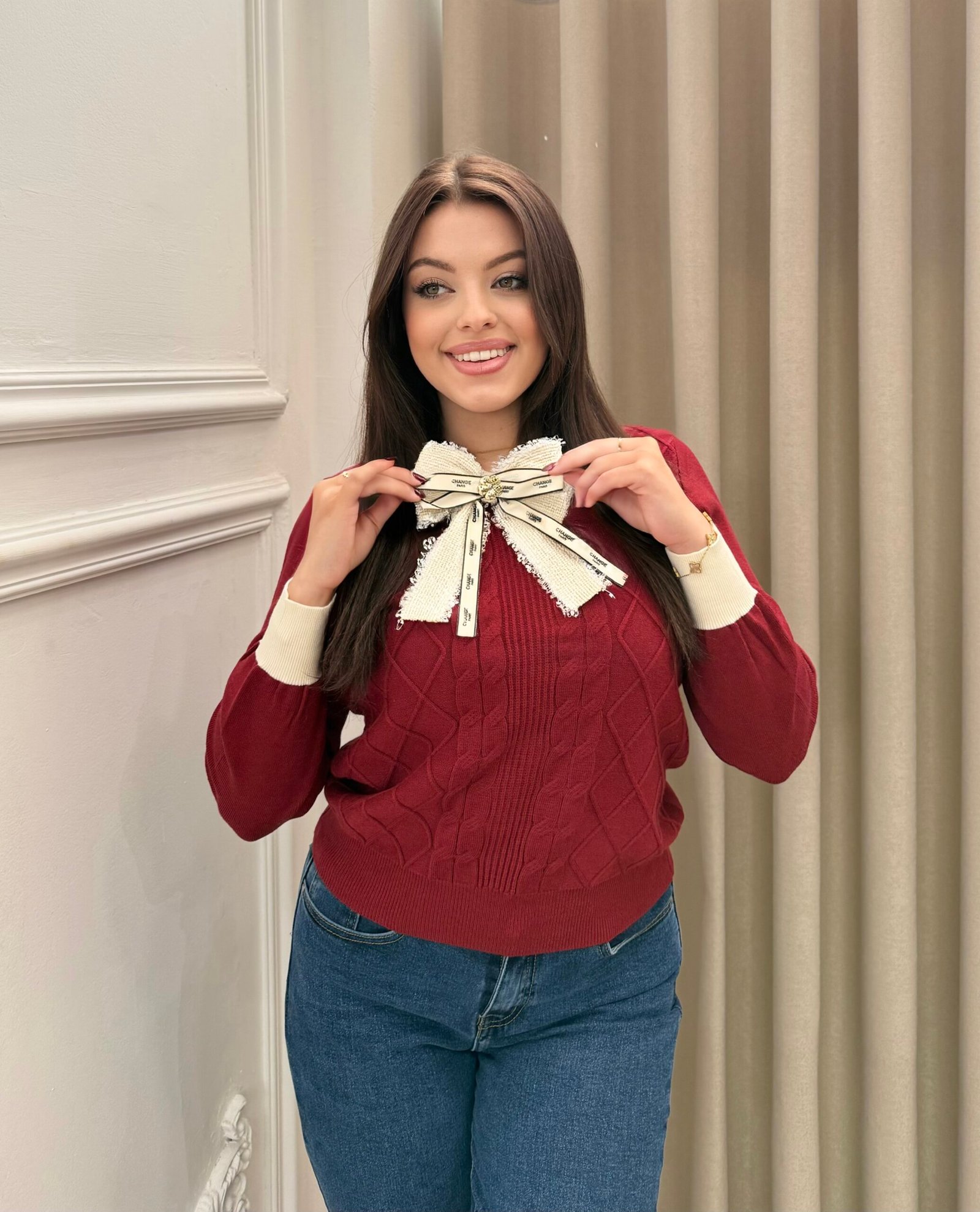 Bluze deve elegante me dizajn te punuar me reliev ne pjesen e perparme dhe menge te gjata. Dekorohet me nje fjongo te madhe kontrastuese ne qafe, qe i shton nje prekje femerore dhe unike. Ideale per kombinime me pantallona apo funde, duke krijuar nje pamje te sofistikuar dhe moderne. Material i bute dhe i rehatshem, perfekt per perditshmeri apo raste speciale.