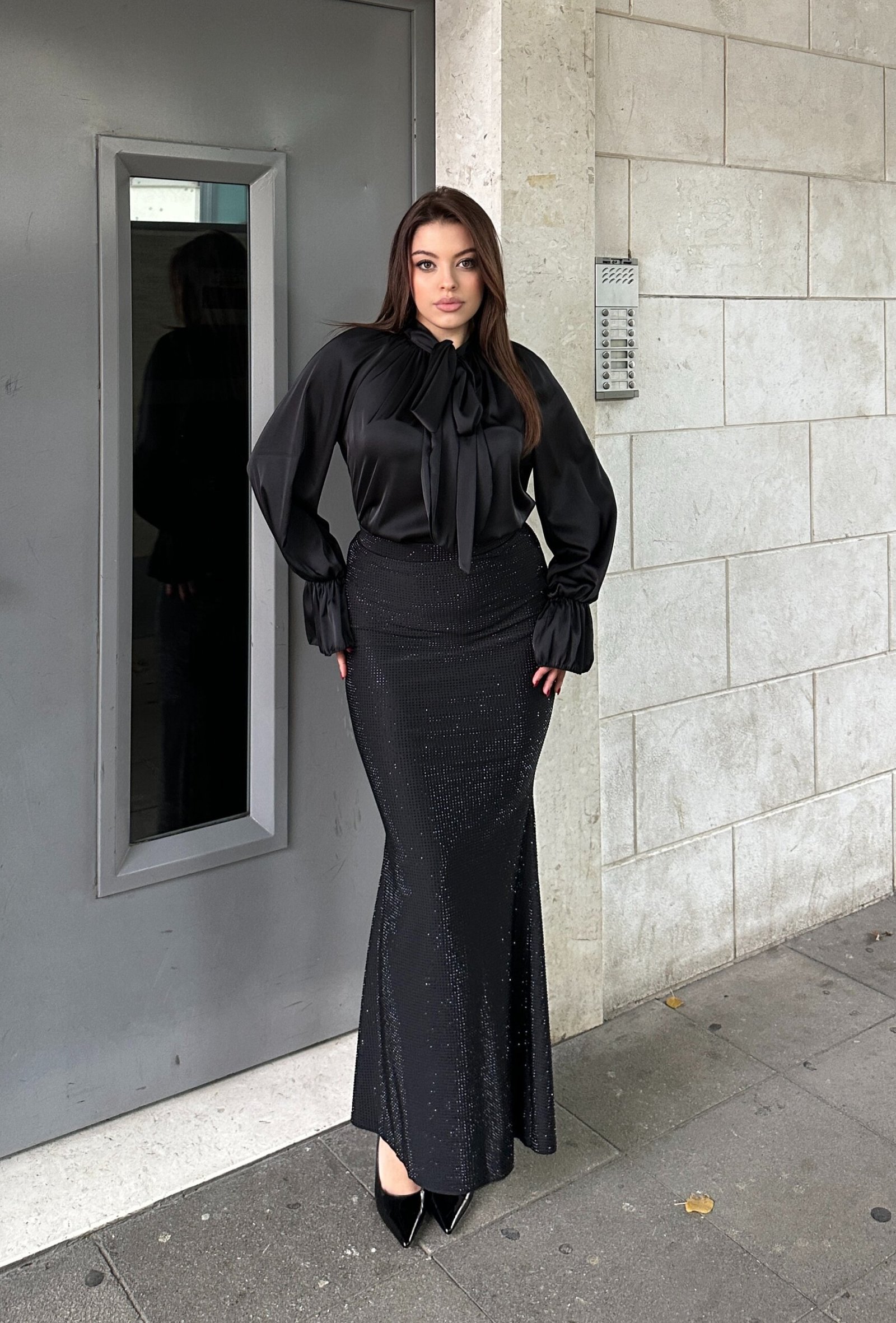 Ky fund elegant me shkelqim vjen me nje siluete te drejte qe ngushtohet butesisht ne bel dhe vijon me nje forme fine drejt fundit, duke i dhene trupit nje pamje te gjate dhe shume elegante. Materiali elastik rri bukur pas trupit dhe krijon nje efekt glamur ne levizje, fale mikro-shkelqimeve qe pasqyrojne driten ne menyre delikate.