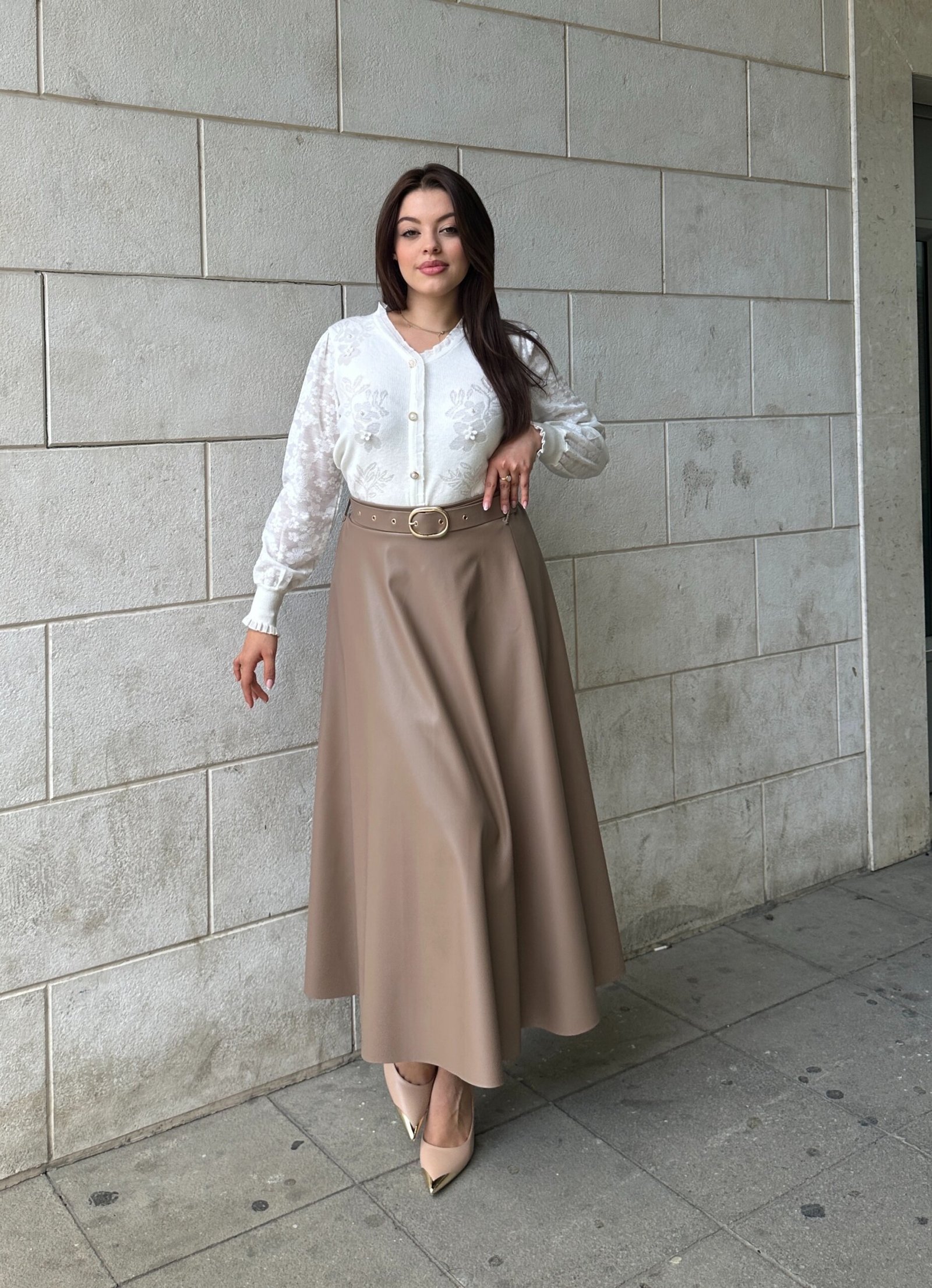 Fund i gjate prej materiali lekure me pamje elegante dhe te rregullt. Ka bel te larte dhe vjen me rrip dekorativ metalik qe thekson belin dhe shton finese ne pamje. Prerja e lire i jep levizshmeri dhe komoditet, ideal per kombinime elegante me kemisha ose triko