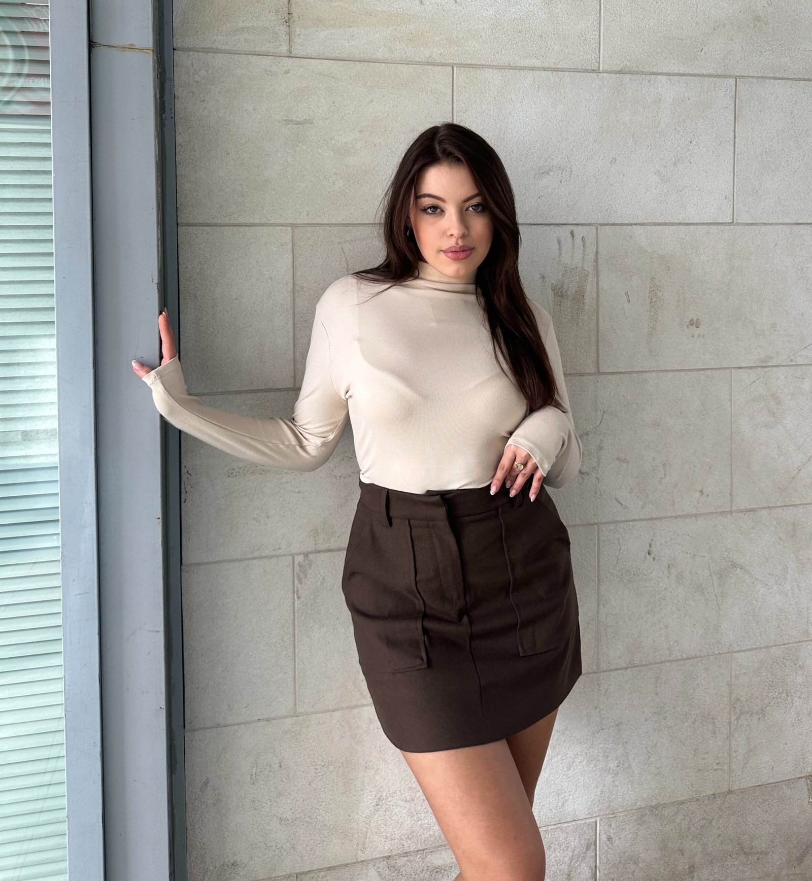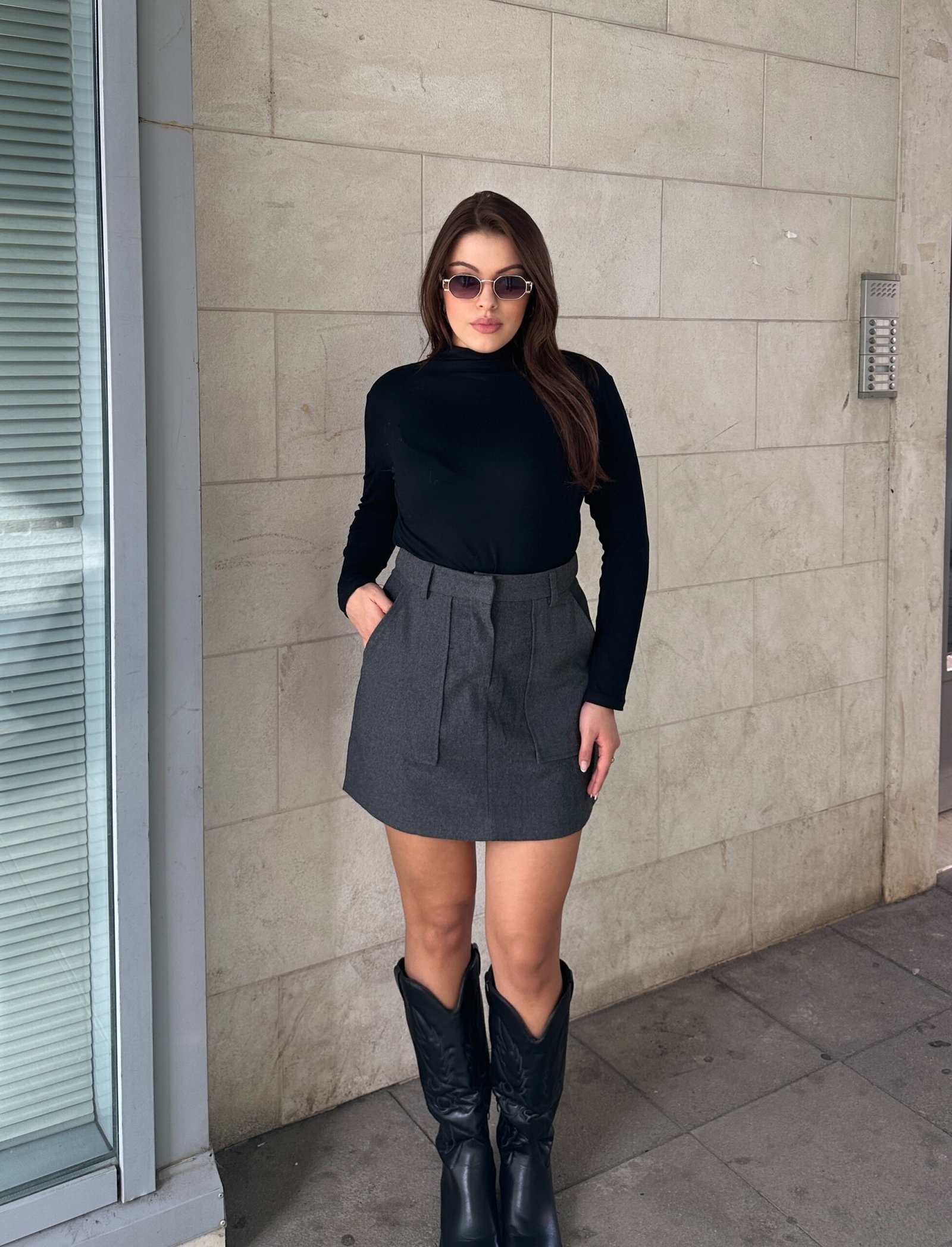 Fund modern me prerje te drejte dhe bel te larte, i realizuar nga material me strukture te forte qe mban forme perfekte. Detajet me pala te lehta ne pjesen e perparme i japin nje pamje elegante dhe te rafinuar. Ideal per kombinime me bluza te ngushta ose triko per nje stil minimalist dhe urban.