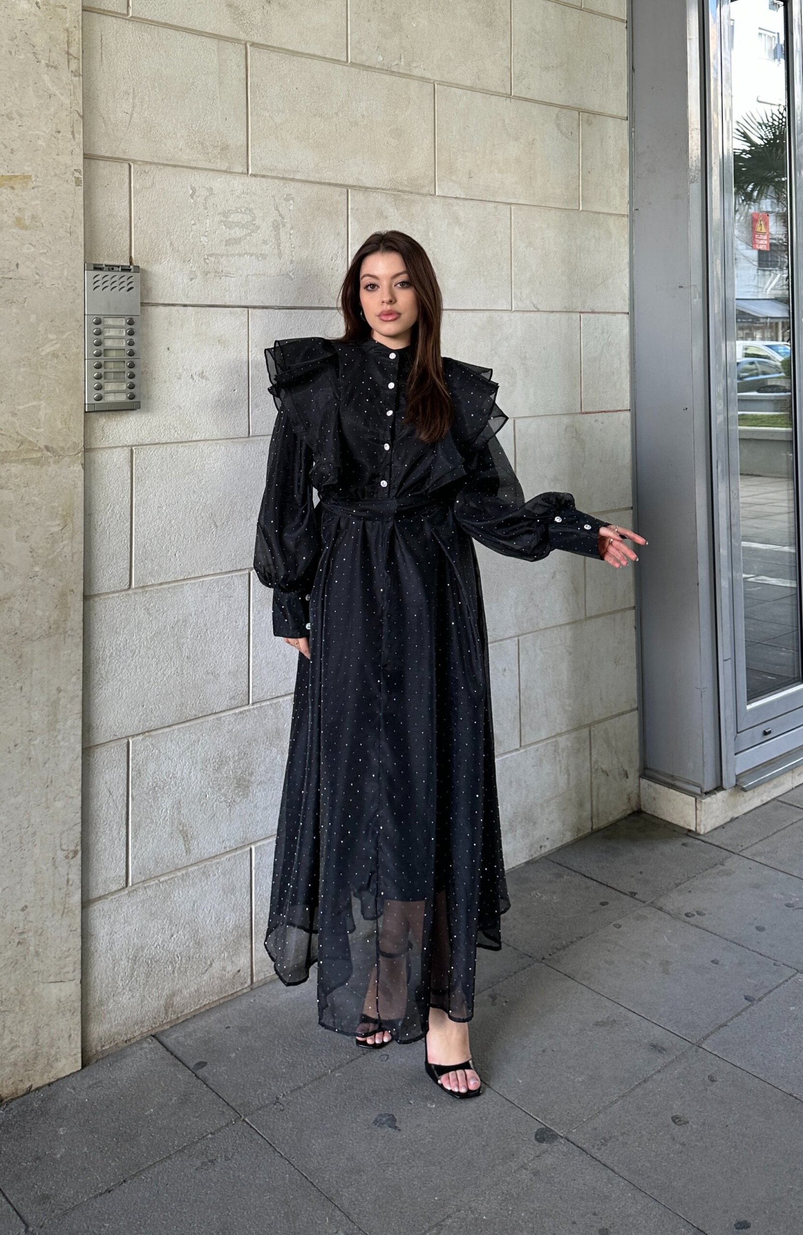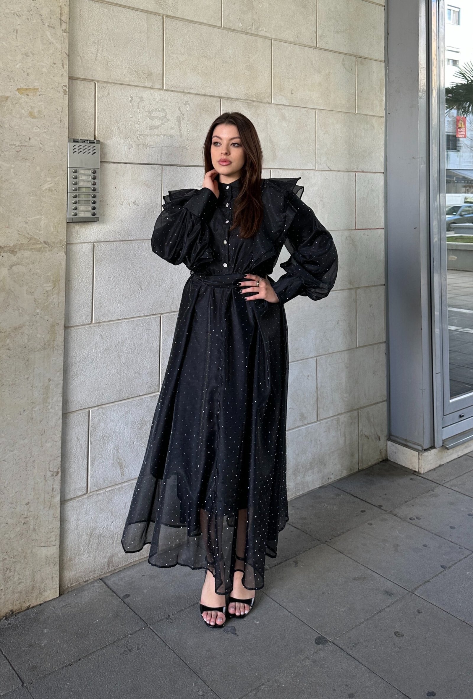Fustan i gjate me dizajn elegant dhe detaje me flutura te theksuara ne supe qe i japin volum dhe stil unik. Model me kopsa perpara dhe rrip ne mes qe thekson belin dhe krijon siluete te bukur. Fundi me shtrese te lehte dhe levizje natyrale e ben ideal per evente, darka apo raste festive ku deshiron nje paraqitje te rafinuar dhe te vecante.