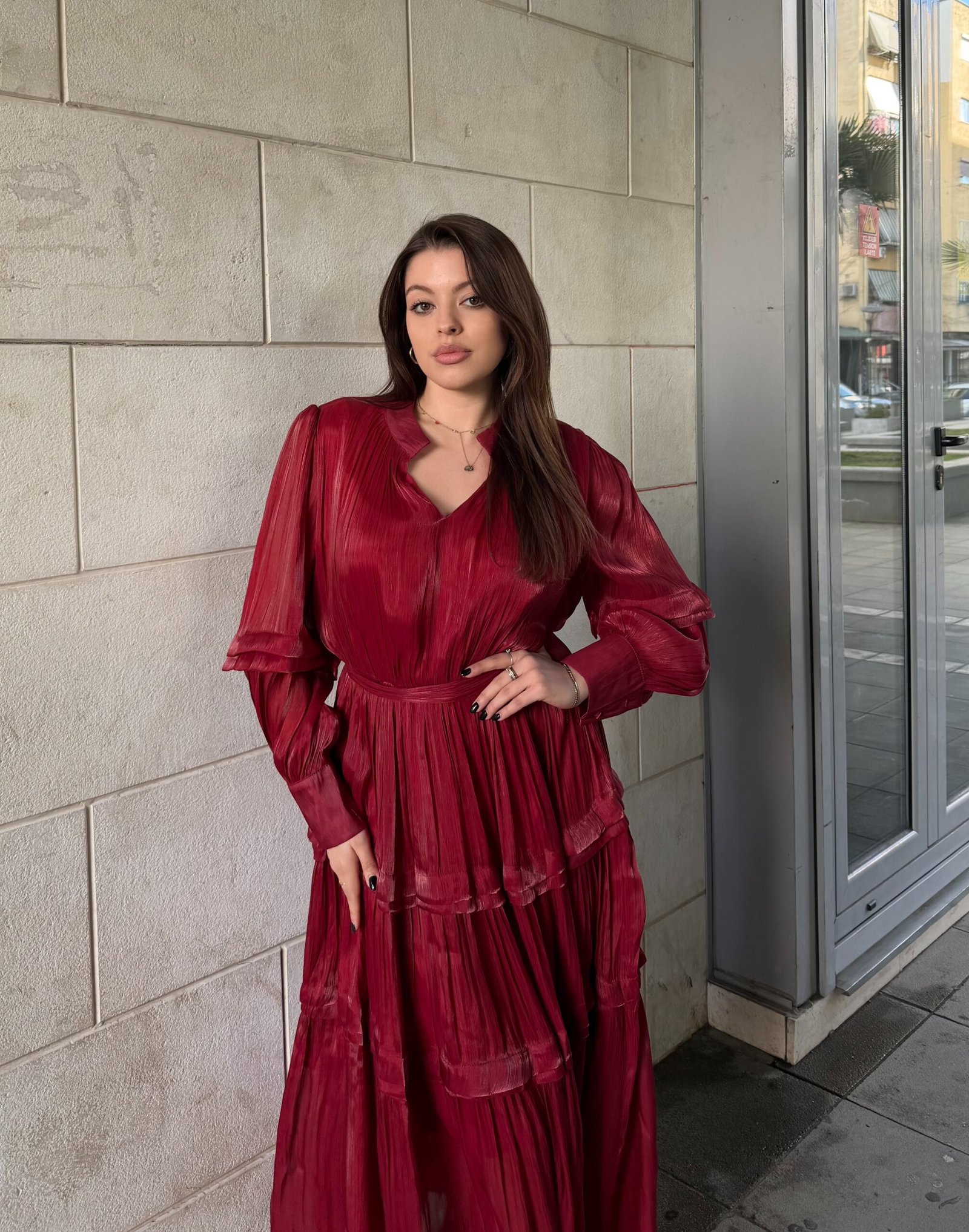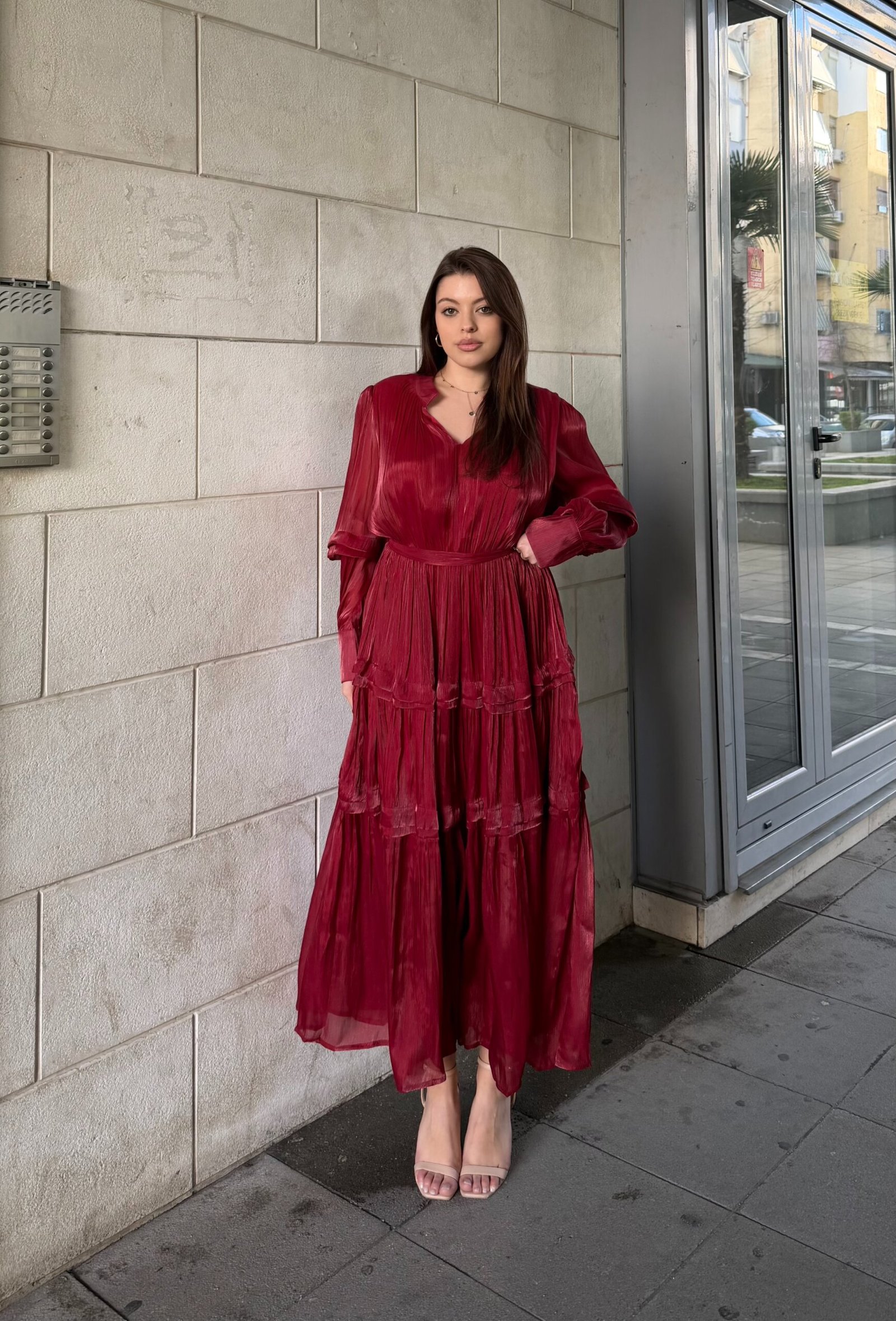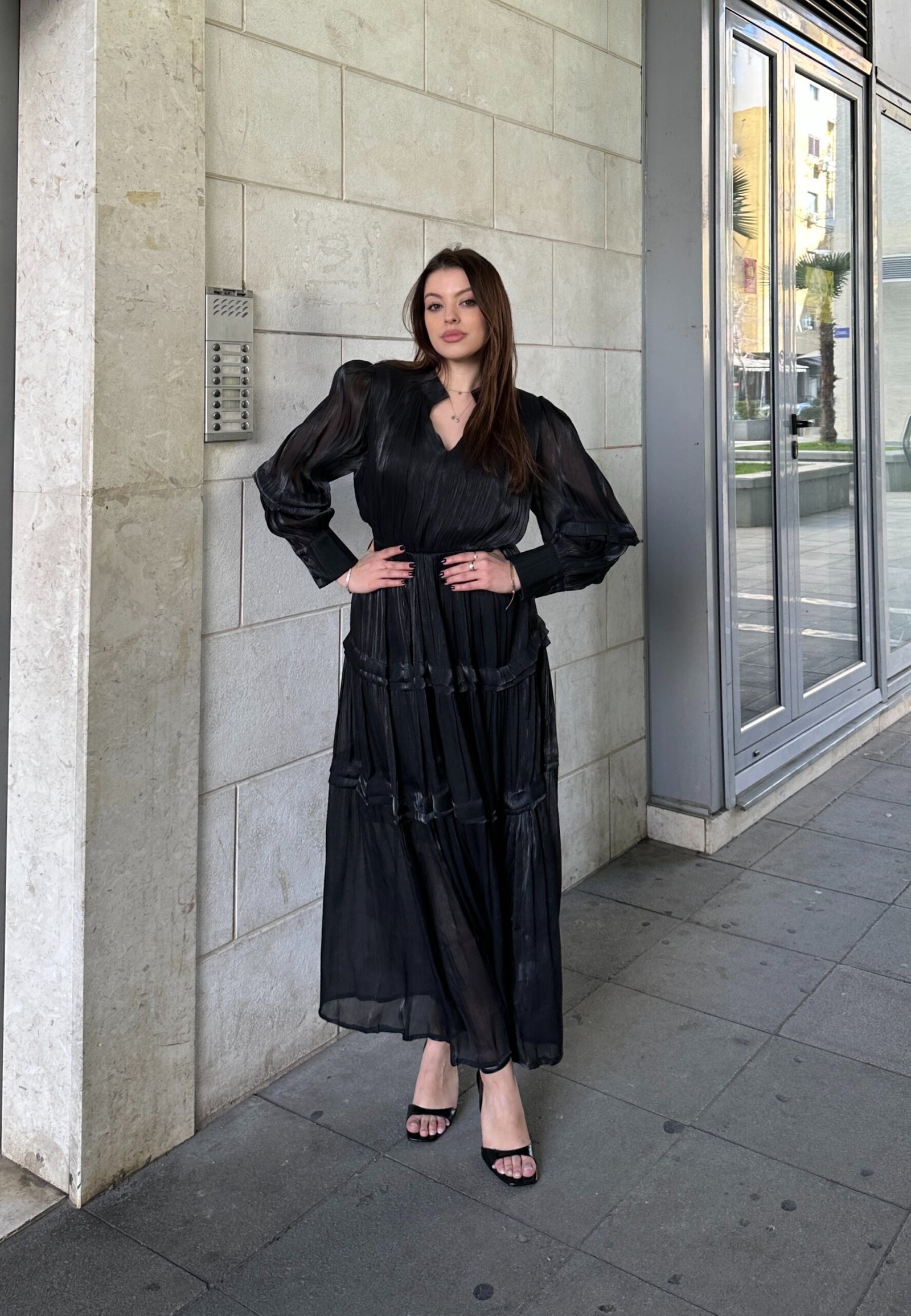 Fustan i gjate me prerje te lirshme dhe shtresa horizontale qe krijojne levizje elegante ne ecje. Pjesa e siperme me jake te hapur dhe menge te gjata me volum i jep nje pamje moderne dhe femerore. Model me bel te theksuar qe formon siluete te bukur dhe fund te lehte qe bie natyrshem. Ideal per evente, darka apo raste ku kerkohet elegance me stil minimalist.