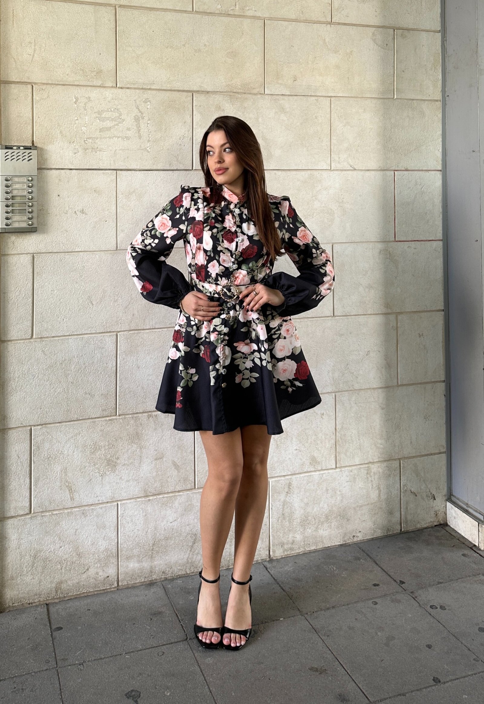 Fustan i shkurter me prerje femerore dhe fund me volum qe krijon siluete te bukur ne levizje. Model me kopsa perpara dhe rrip ne mes qe thekson belin dhe i jep forme trupit. Printi me lule shton elegance dhe stil romantik, ndersa menget e gjata me volum e bejne ideal per evente, festa apo dalje speciale ku deshiron nje paraqitje shik dhe te vecante.