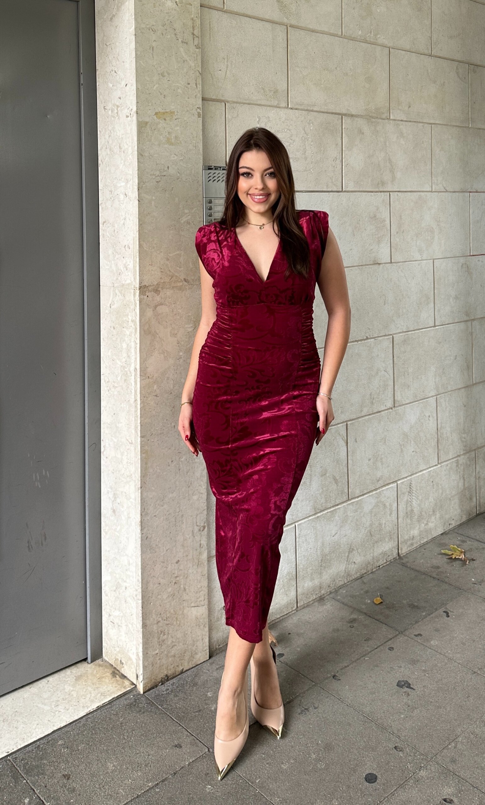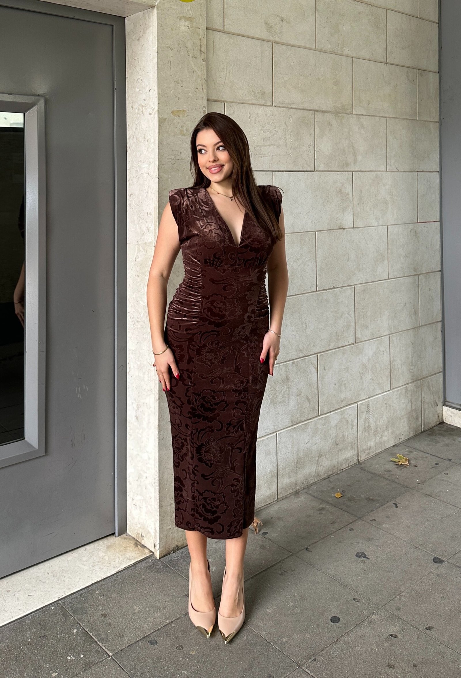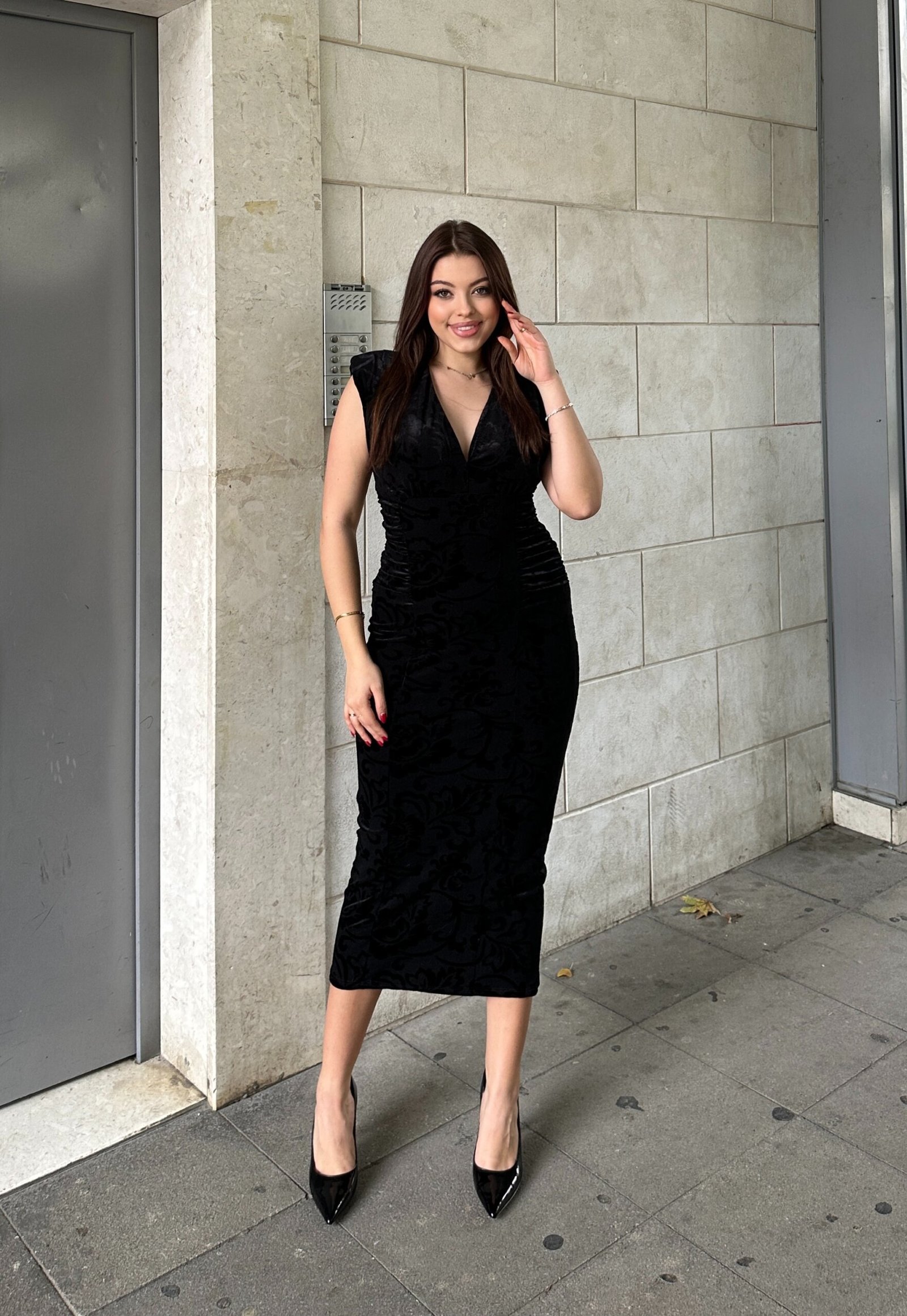 Fustan elegant i punuar nga kadife luksoze, me efekt barok dhe strukture qe e nxjerr trupin shume hijshem. Modeli ka vize V ne dekolte, shpatulla te strukturuara dhe mblidhet lehtesisht ne bel per te krijuar forme perfekte. Gjatesia midi e ben ideal per evente, darka, festa apo kombinime me taka per nje pamje teresisht glamuroze.