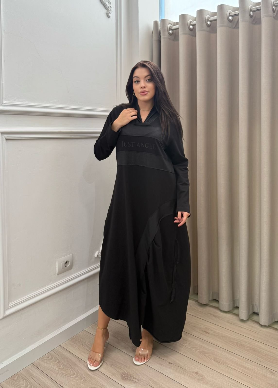 Fustan i gjate oversize me dizajn modern dhe detaje ne pjesen e perparme. Model i rehatshem dhe praktik, ideal per perdite ose kombinime casual me stil.