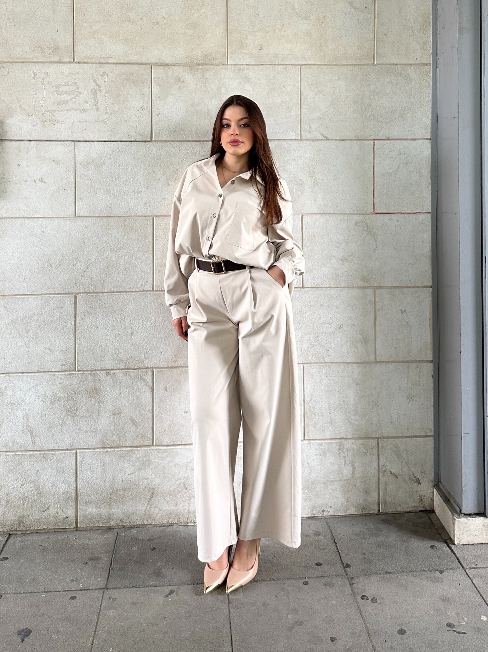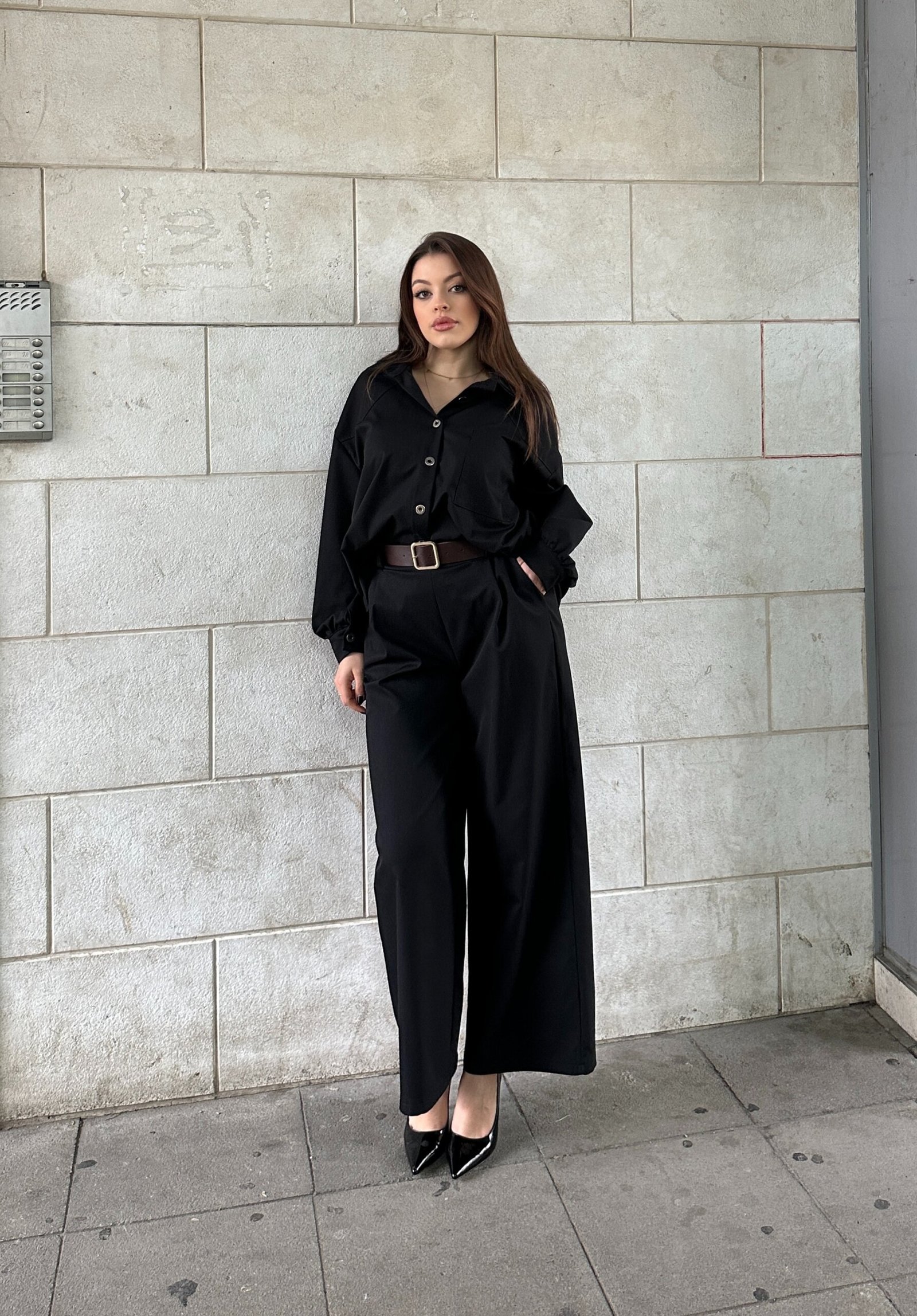 Kostum elegant me kemishe me prerje te lirshme dhe pantallona me bel te larte dhe prerje wide leg. Model modern me linja te pastra qe krijon siluete te rregullt dhe te rafinuar. Ideal per kombinime formale ose smart casual, per nje look classy dhe te kuruar.