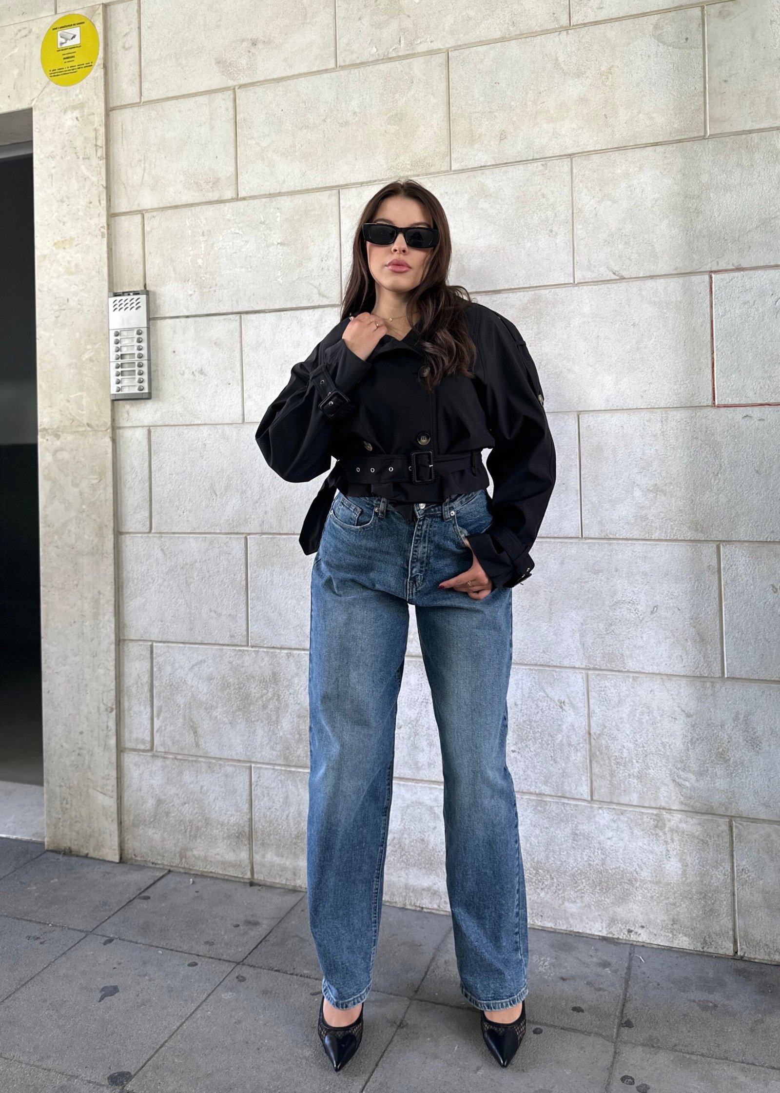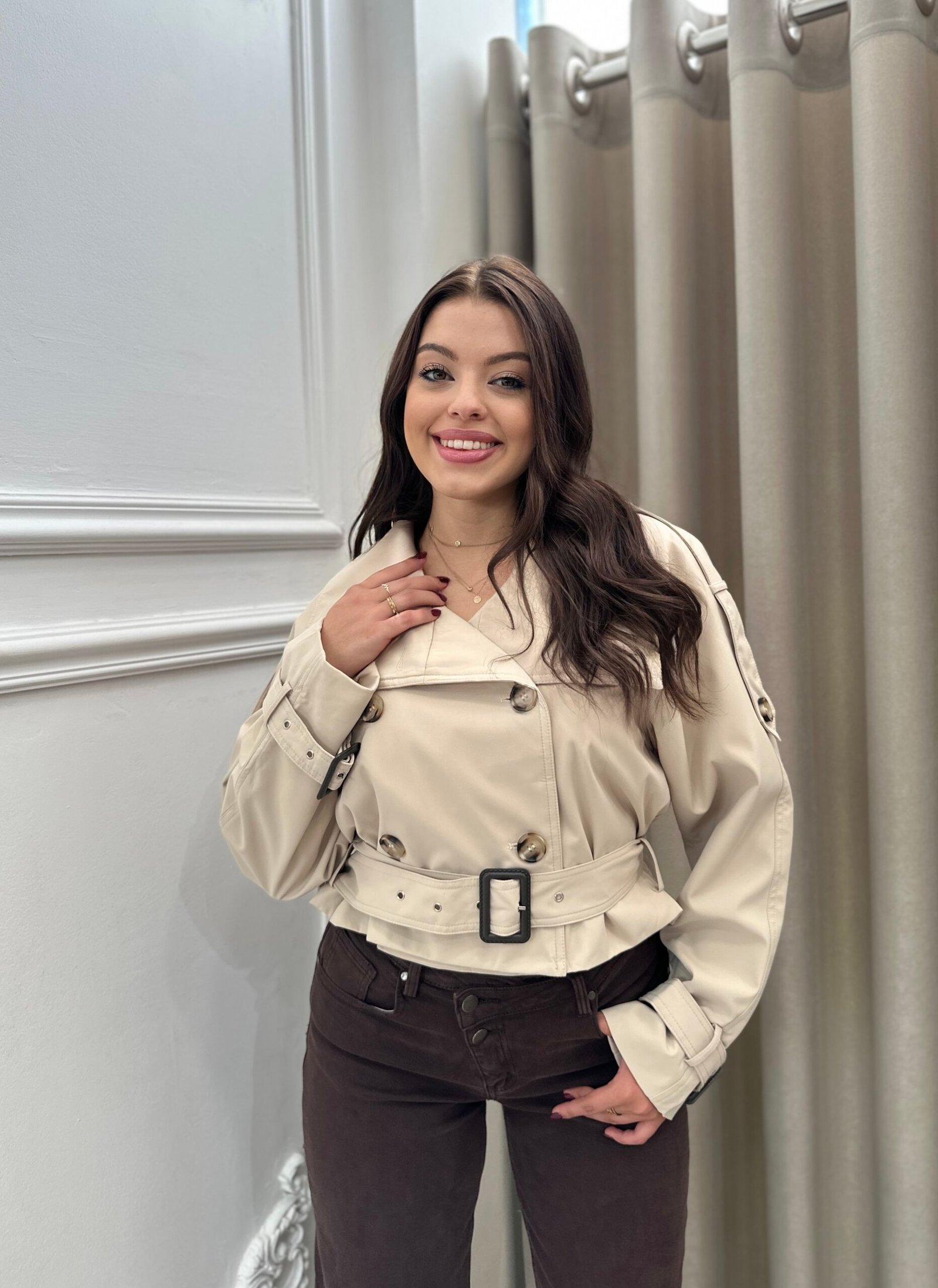Pardesy moderne me dizajn te shkurter, rrip ne bel dhe kopsa dekorative. Jep nje pamje elegante dhe kombinohet lehtesisht si per perdite ashtu edhe per dalje.