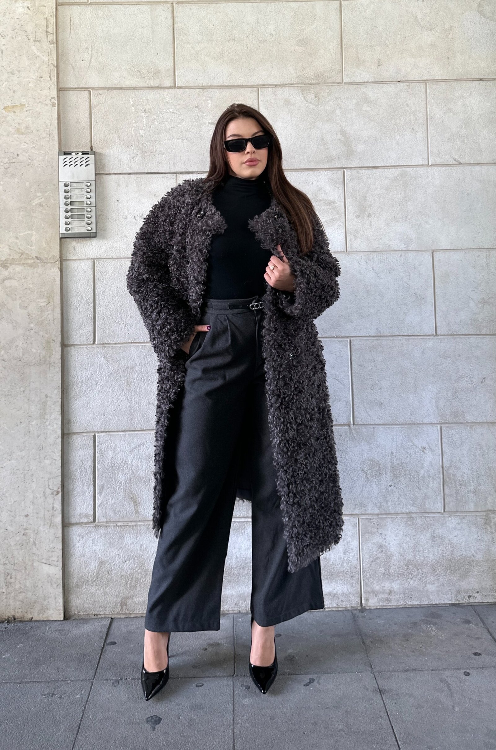 Pellush i gjate curly, i punuar me material te bute dhe me teksture karakteristike qe ofron ngrohtesi dhe komoditet maksimal. Dizajn elegant me kopsa ne pjesen e perparme dhe prerje te lire per nje pamje moderne dhe shik. Perfekt per veshje te dites ose kombinime elegante ne sezonin e ftohte.