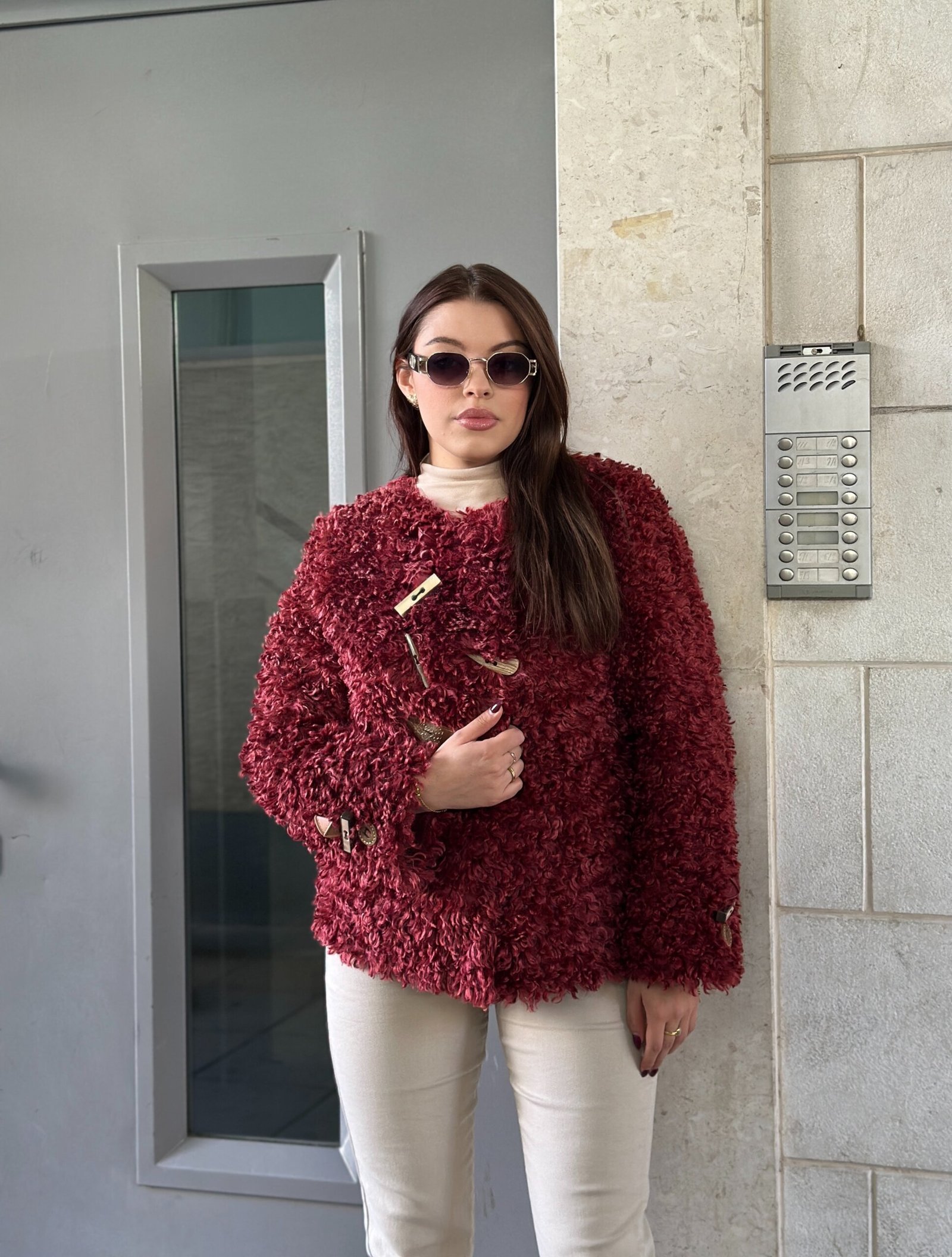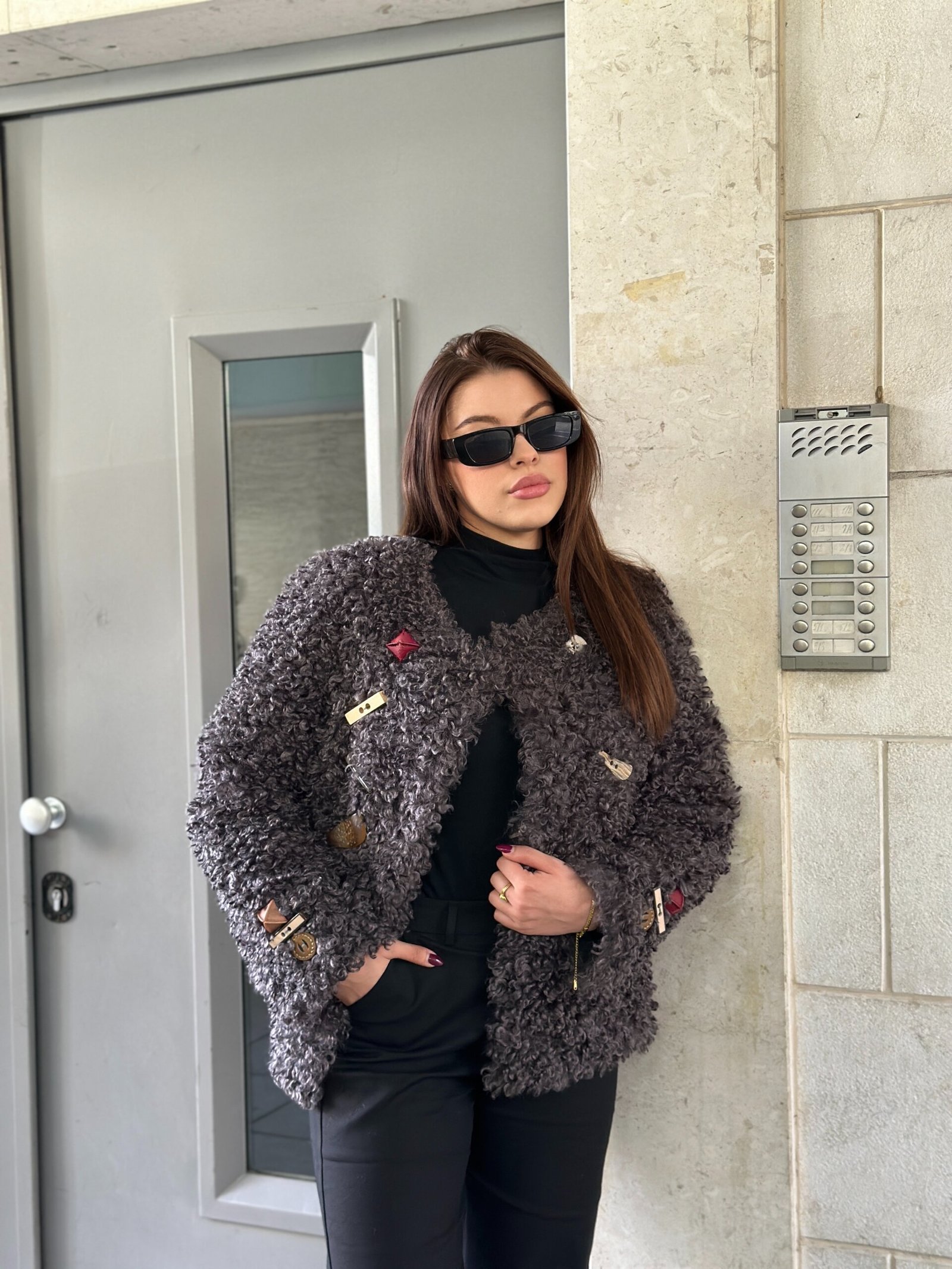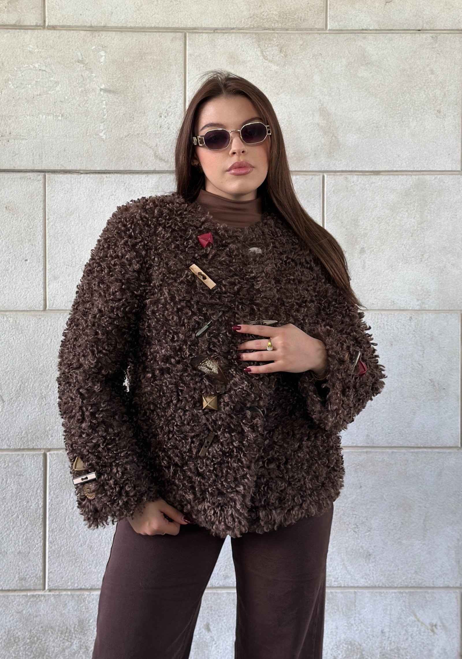 Pellush curly i bute dhe me volum, perfekt per nje pamje moderne dhe komode. Model i vecante me mbyllje dekorative te personalizuara qe i japin nje stil te dallueshem. Material i ngrohte dhe cilesor, ideal per veshje te dites apo kombinime elegante ne sezonin e ftohte.