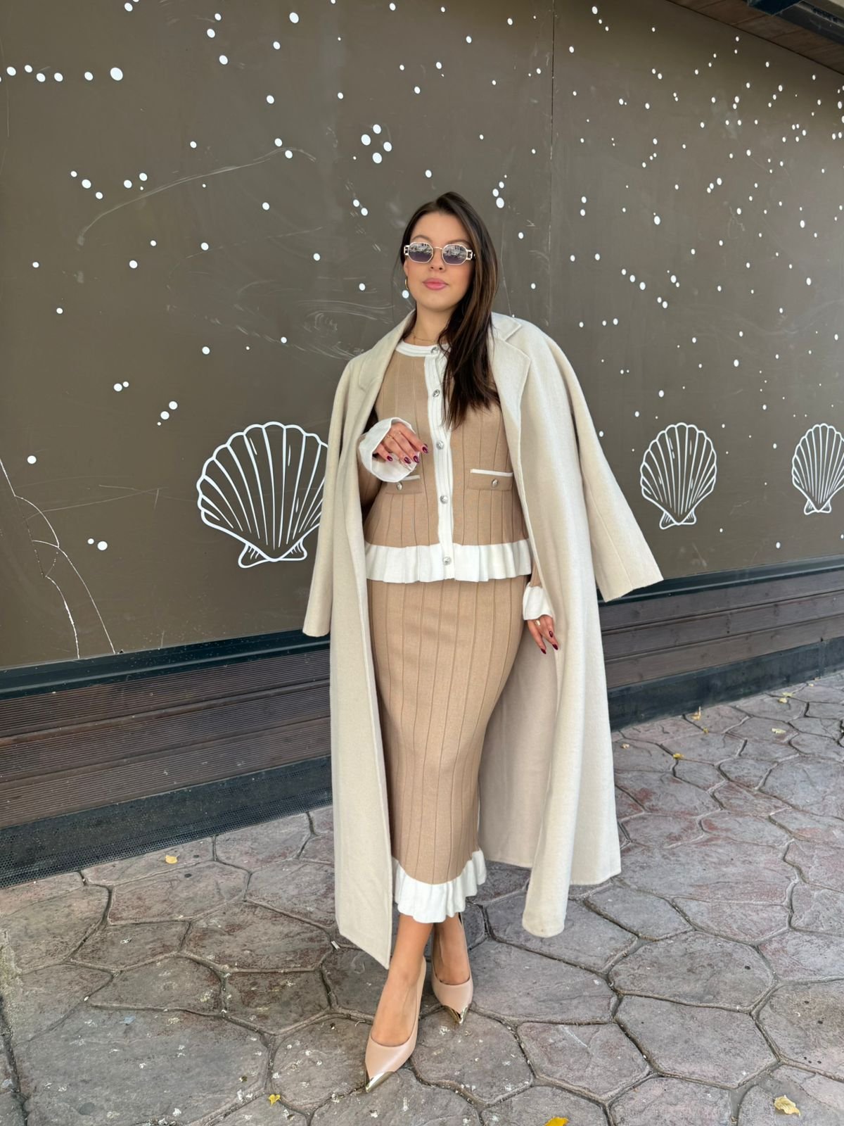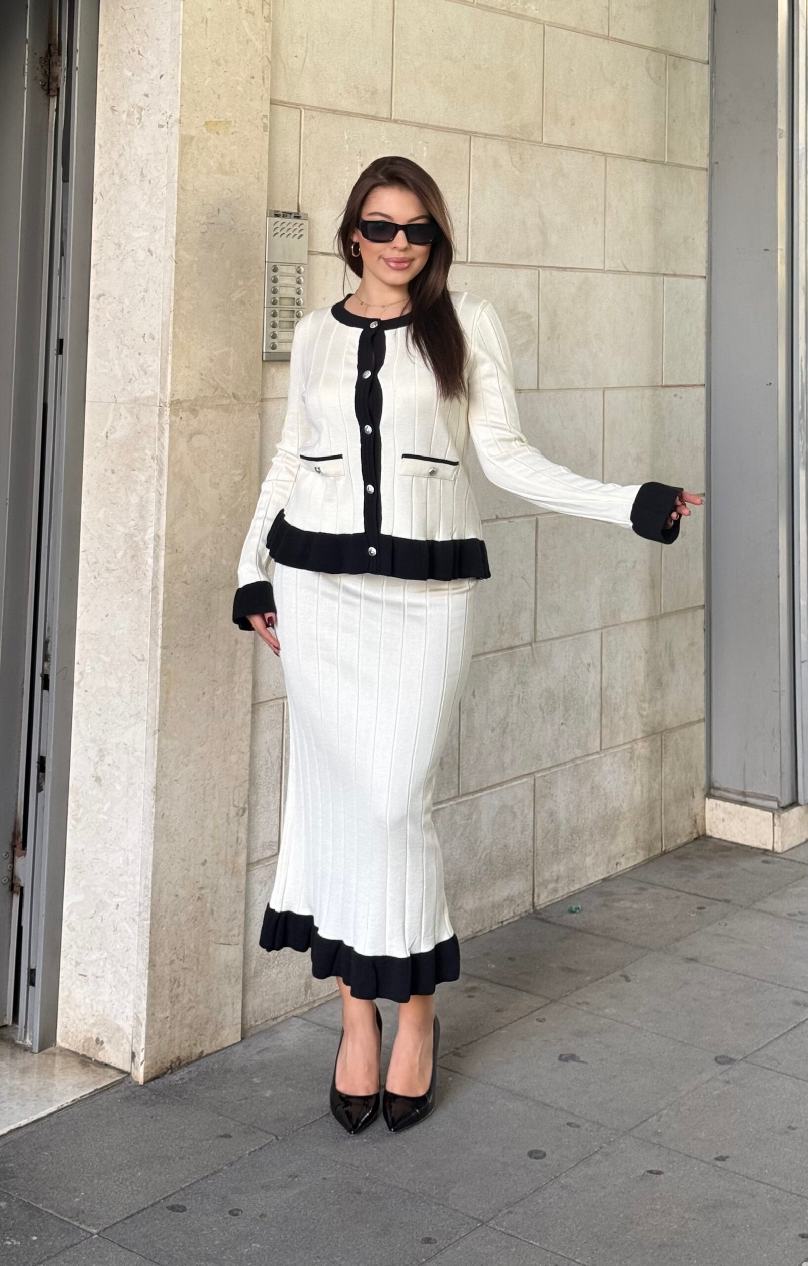 Set elegant deve, i perbere nga fundi i gjate elastik dhe triko me kopsa, i theksuar me detaje kontrasti ne jake, fund dhe menge. Material i bute dhe i rehatshëm, i pershtatshem si per perditshmeri ashtu edhe per raste te vecanta. Nje kombinim klasik dhe modern qe ofron finesë dhe stil ne çdo veshje.