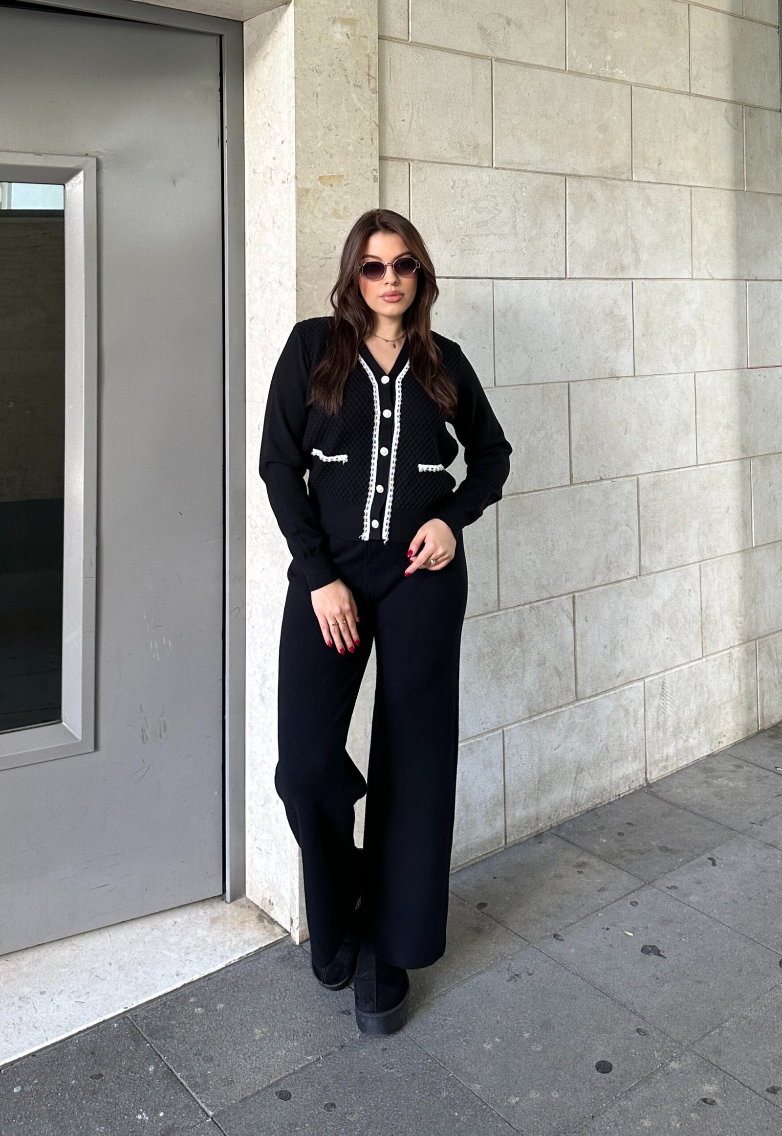 Set shume komod dhe shik per perdorim te perditeshem, me pamje elegante dhe detaje klasike. Trikoja ka kopsa dekorative dhe xhepa te vegjel ne pjesen e perparme, duke i dhene nje prekje stil “chanel look”. Pantallonat e gjera krijojne linje te zgjatur dhe jane ideale per komfort gjate dites.