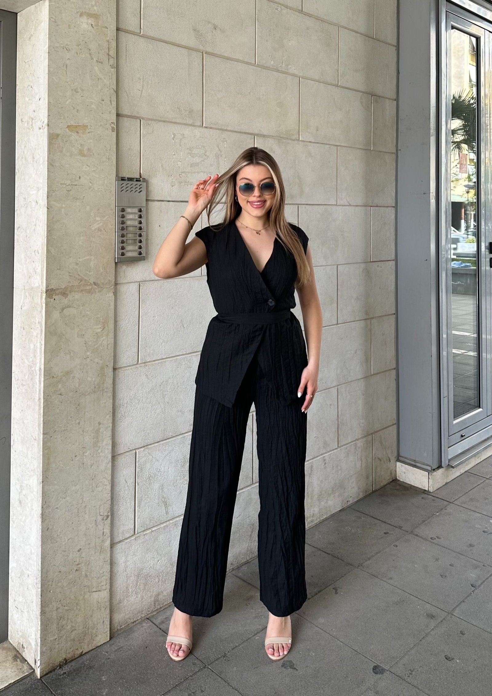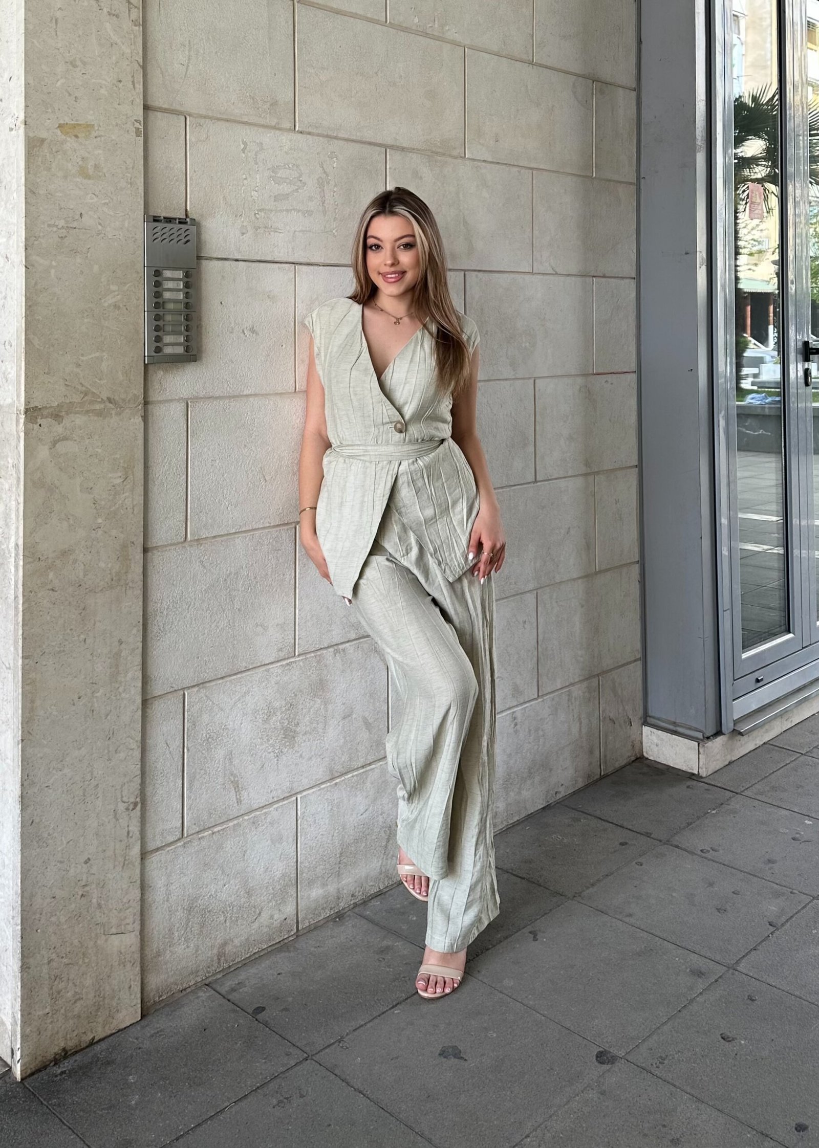 Set modern i perbere nga jelek elegant dhe pantallona wide leg me prerje te lire. Jeleku ka dizajn crossover me rrip ne bel qe thekson silueten dhe krijon nje pamje te rregullt dhe te sofistikuar. Pantallonat jane te gjera dhe te lehta, duke ofruar rehati maksimale dhe levizje natyrale. Materiali i bute dhe i ajrosur e ben kete set ideal per kombinime ditore ose look chic urbane.