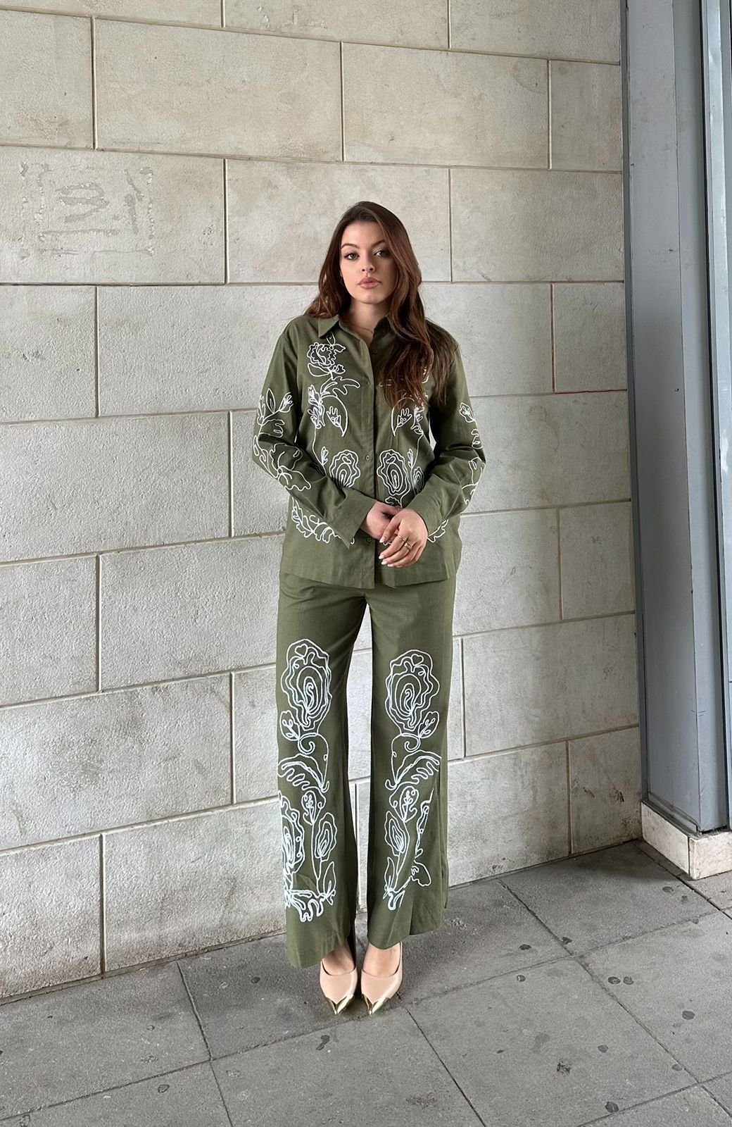 Set modern me kemishe dhe pantallona me prerje te drejte dhe te rehatshem. Këmisha me kopsa dhe jakë klasike kombinohet ne menyre perfekte me pantallonat me prerje te gjere, duke krijuar nje look te vecante dhe elegant. Printi artistik i jep stil unik dhe e ben ideal si per dalje ditore ashtu edhe per kombinime me karakter.