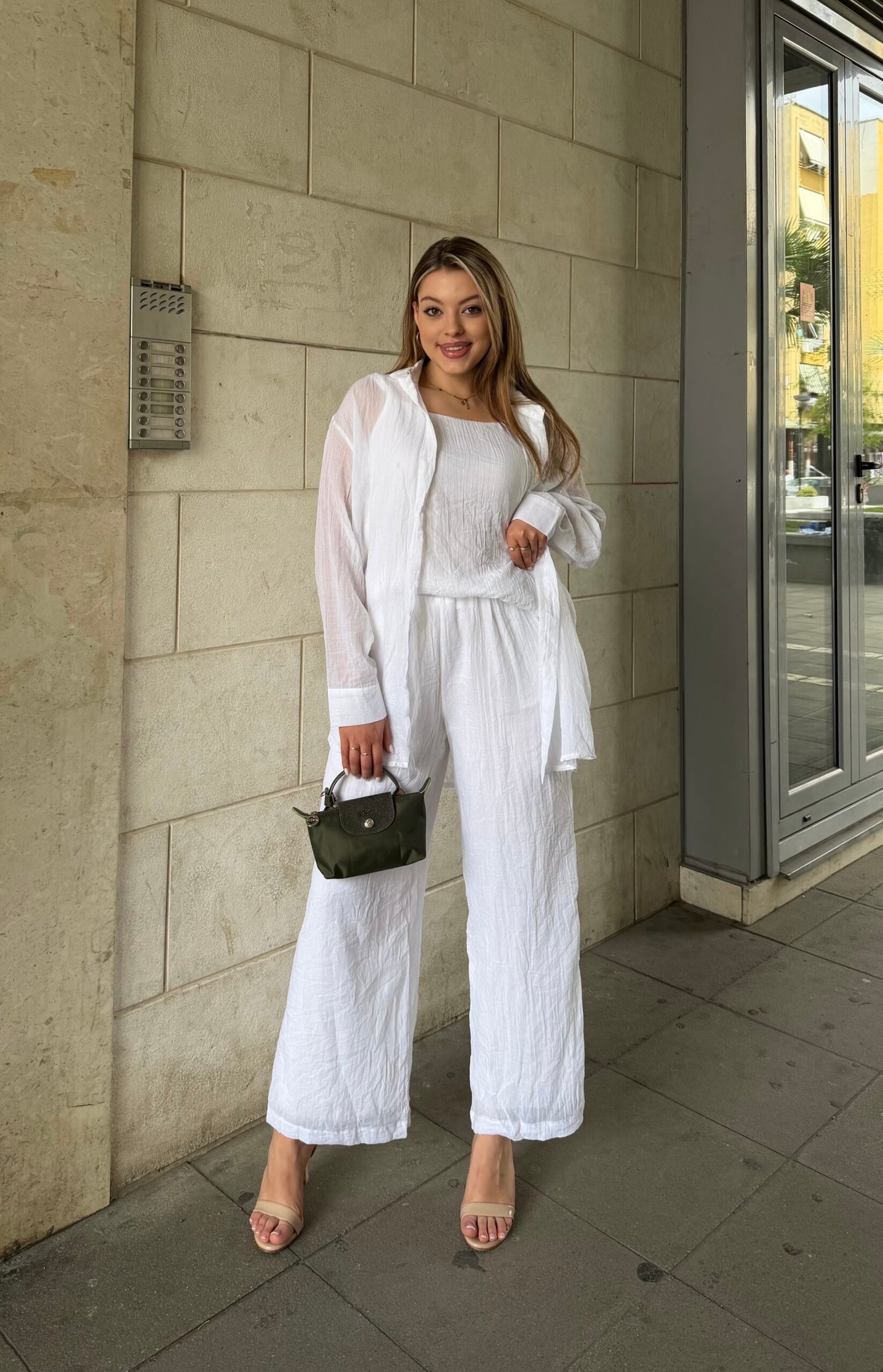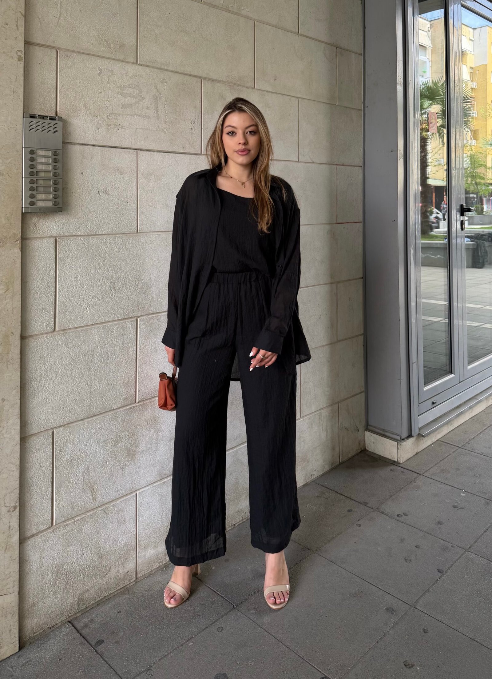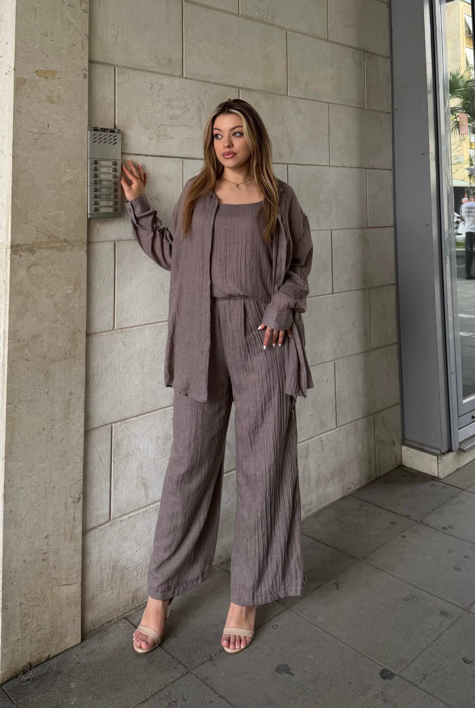 Set modern dhe praktik i perbere nga kemishe e lehte, kanatiere dhe pantallona me prerje te lire. Kombinimi perfekt per nje look minimal dhe elegant, qe ofron rehati maksimale gjate gjithe dites. Pantallonat kane forme te gjere per levizje te lire, ndersa kemisha shton stil dhe fleksibilitet ne kombinim. Ideal per perdorim ditor, pushime apo dalje casual me stil.