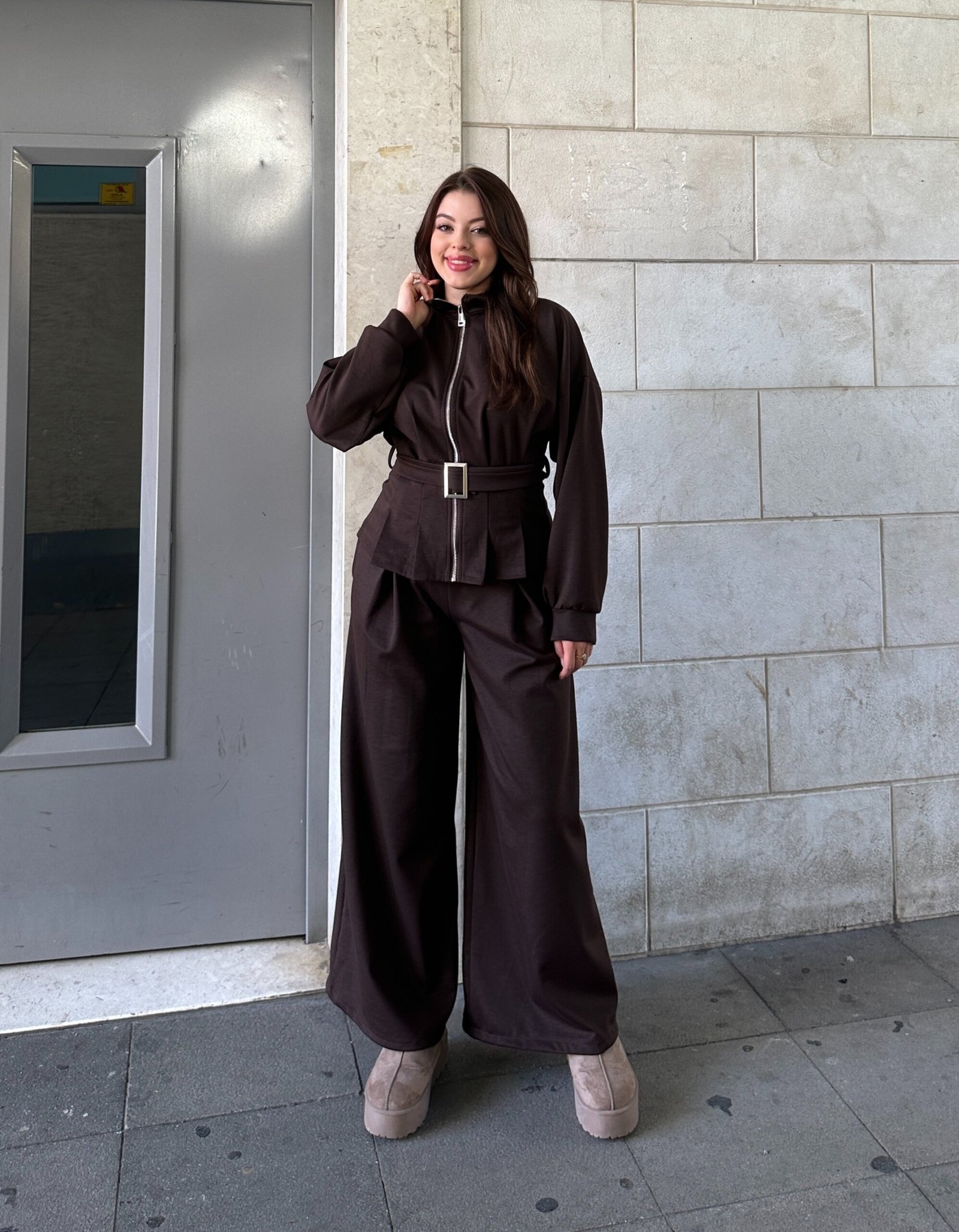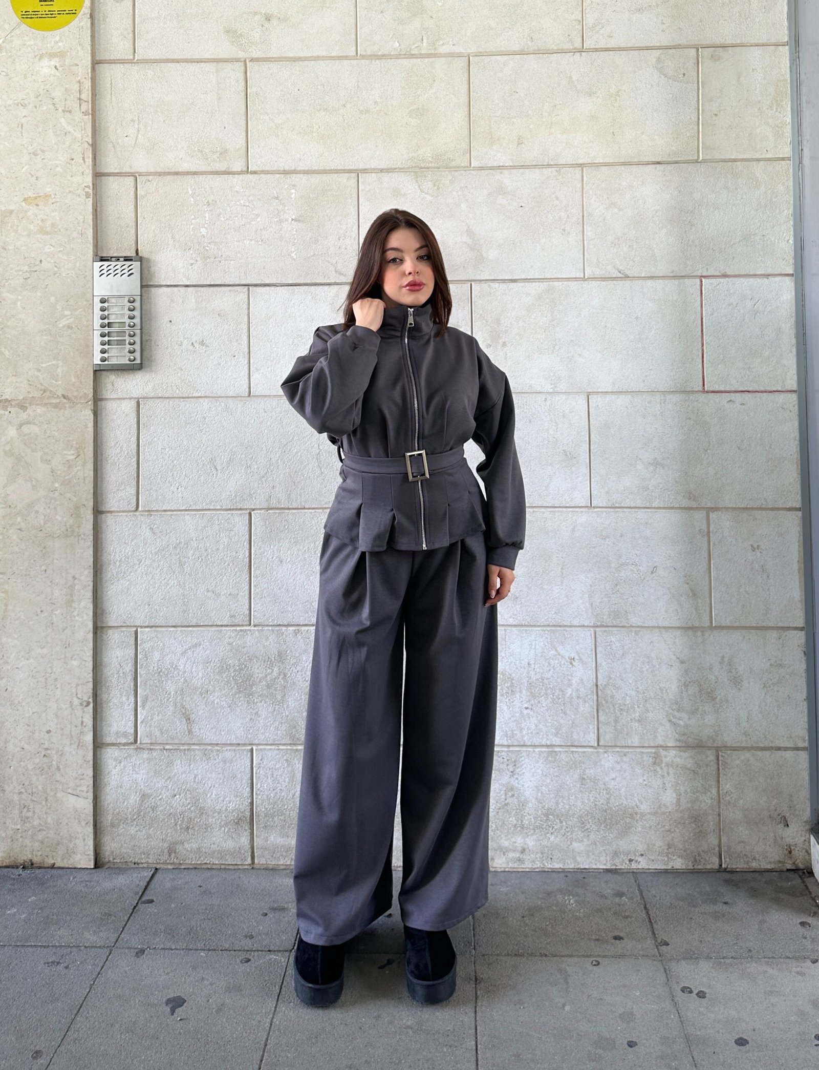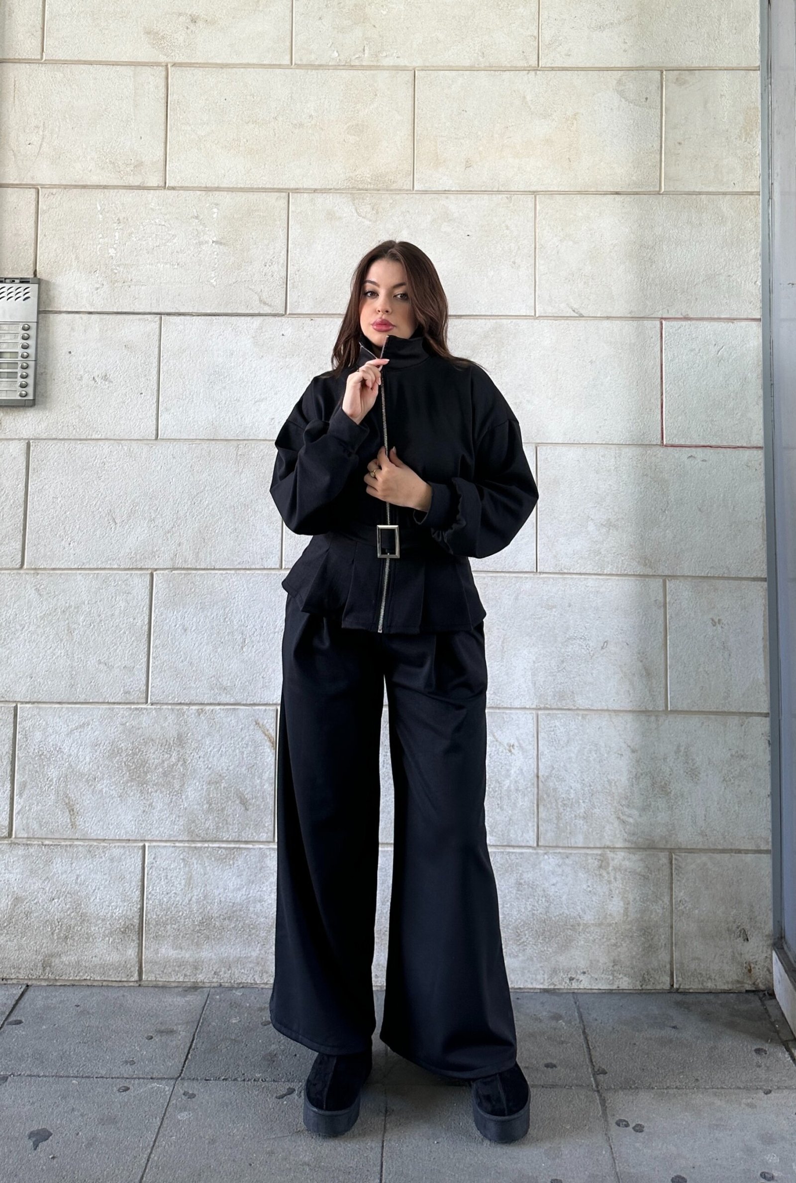 Set modern me xhaket te gjere dhe pantallona te drejta, i punuar nga material me push te bute nga brenda per ngrohtesi dhe rehati. Xhaketa mbyllet me zinxhir ne qender dhe ka brez ne bel qe thekson linjen trupore, duke i dhene veshjes nje pamje elegante dhe te rregullt. Ideale per kombinime casual ose per dalje elegante ne dite te ftohta.