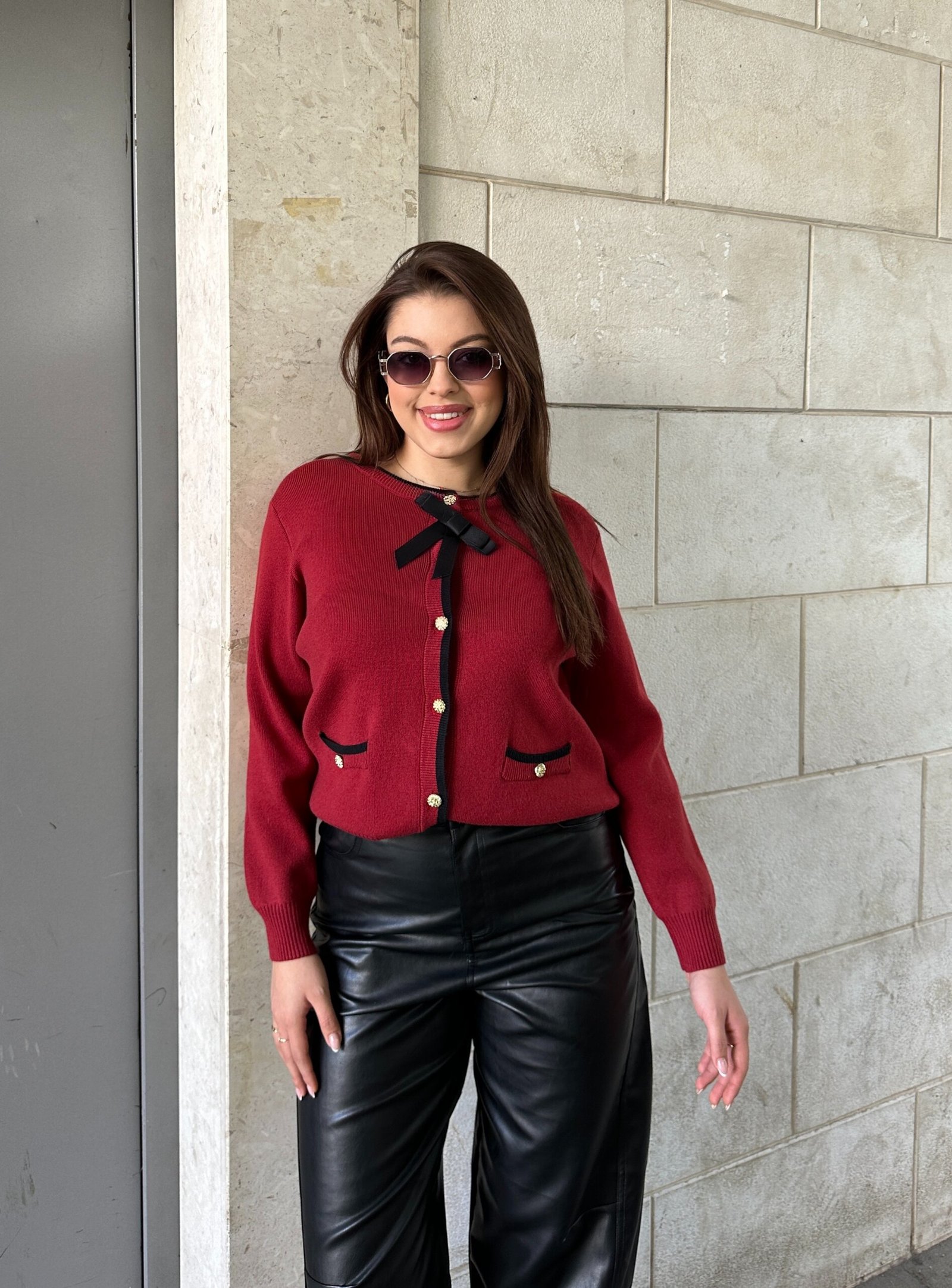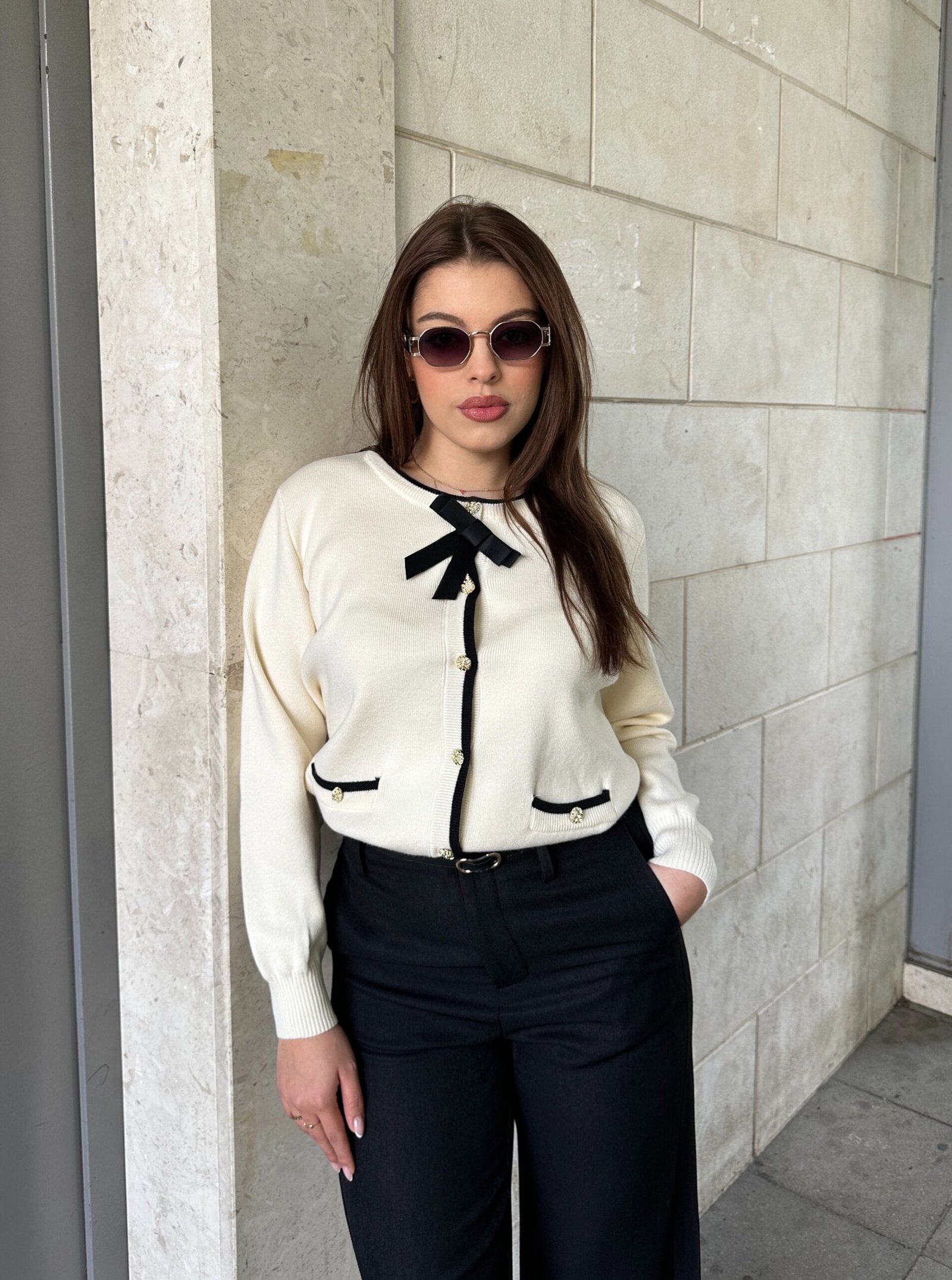 Triko elegante me dizajn te vecante, i zbukuruar me fjongo te zeze ne qafe dhe kopsa dekorative. Ka dy xhepa te vegjel ne pjesen e perparme me vije kontrasti, qe i shtojne nje prekje fine dhe moderne. Ideale per kombinime me pantallona lekure apo funde klasike, duke ofruar nje stil te rafinuar dhe femeror.