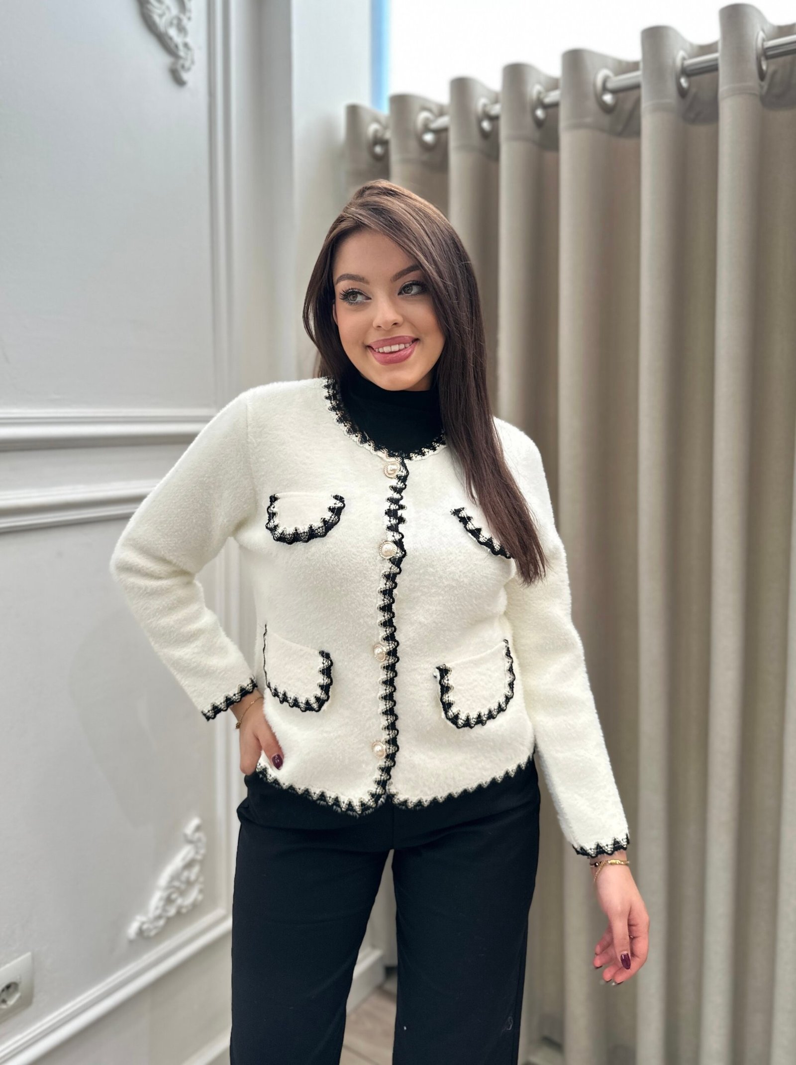 Xhakete stil Chanel me prerje klasike dhe detaje te rafinuara ne skaje. E punuar me material te bute dhe me kopsa me perla, kjo veshje sjell nje pamje elegante dhe moderne. Mund te kombinohet lehtesisht si me pantallona, ashtu edhe me funde, duke e bere perfekte si per perditshmeri, ashtu edhe per evente te vecanta.