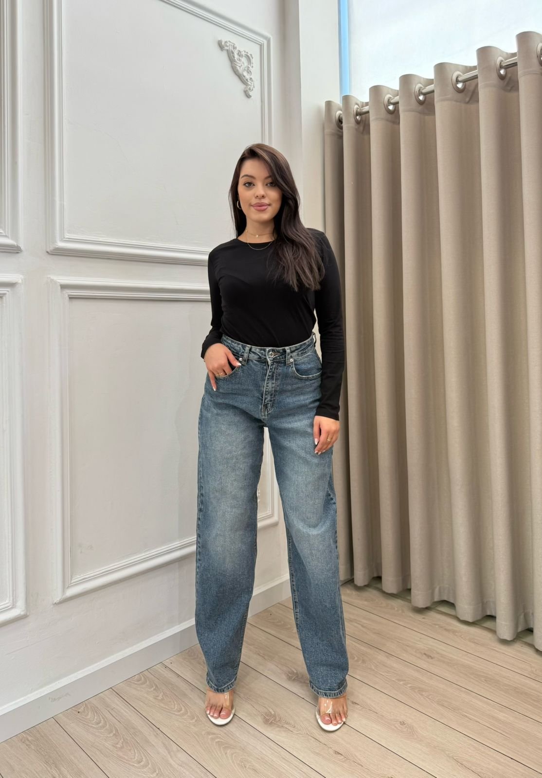 Xhinse blu balon fit me bel te larte, me prerje te lire ne pjesen e siperme dhe ngushtim te lehte poshte. Modeli balon ofron komoditet maksimal dhe nje pamje unike casual, duke i bere perfekte per perditsmeri dhe kombinime moderne. Te rehatshme, praktike dhe gjithmone ne mode.