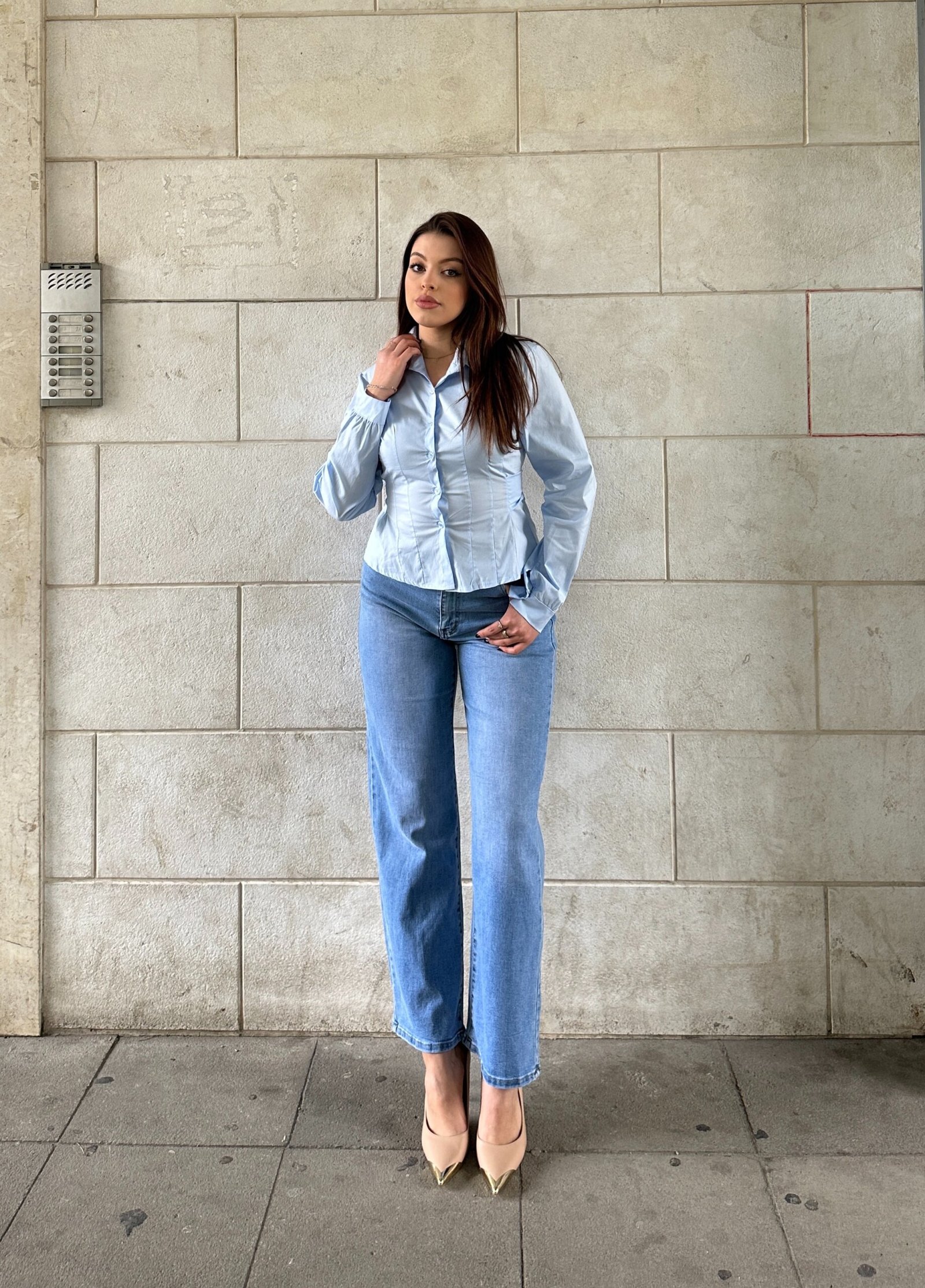Xhinse ne ngjyre blu te hapur me bel mesatar dhe prerje straight qe krijon siluete te rregullt dhe elegante. Model klasik me renie natyrale ne kembe, i lehte per kombinime si casual ashtu edhe me taka per nje look me te rafinuar. Denim cilesor dhe i rehatshem per perdorim te perditshem.