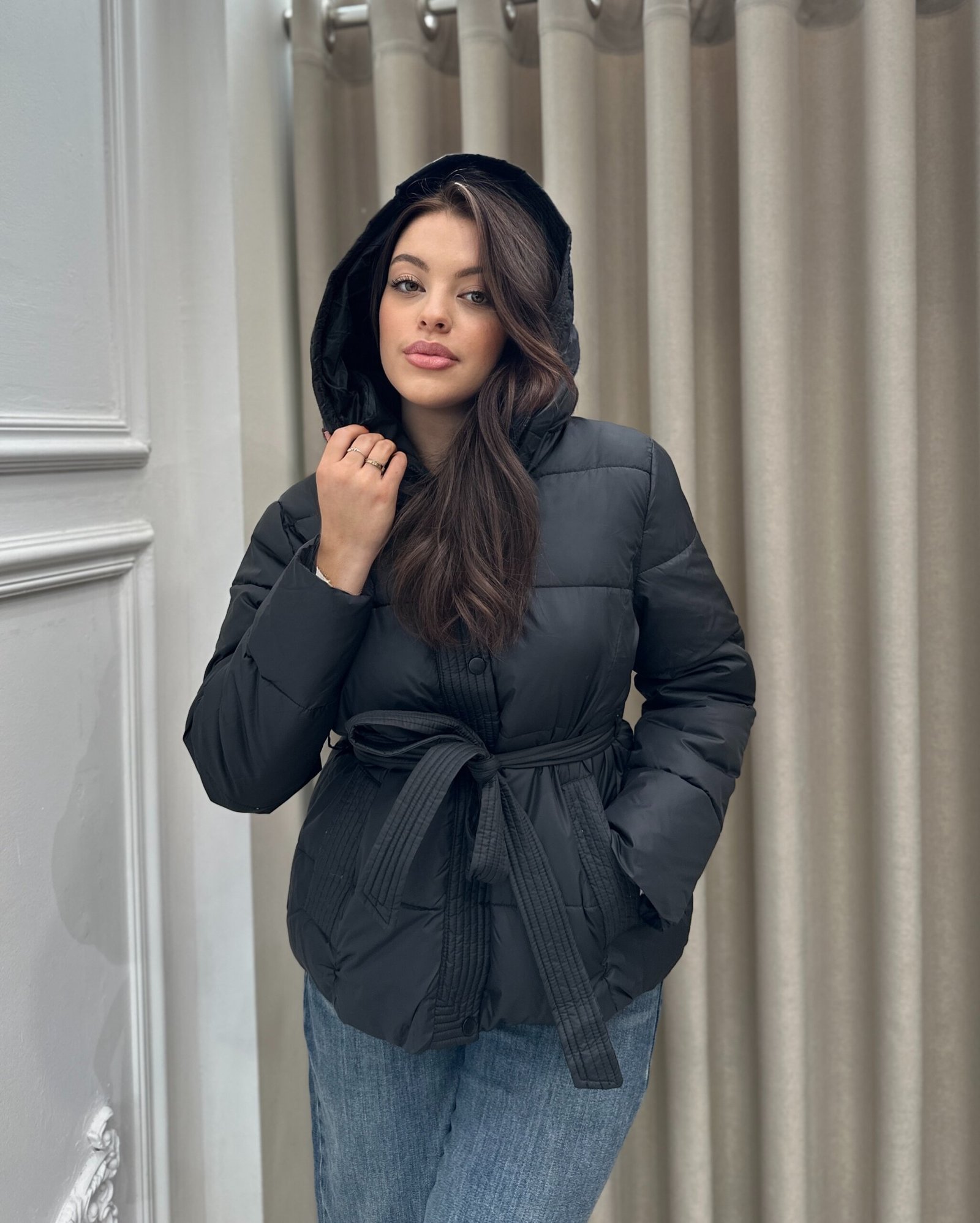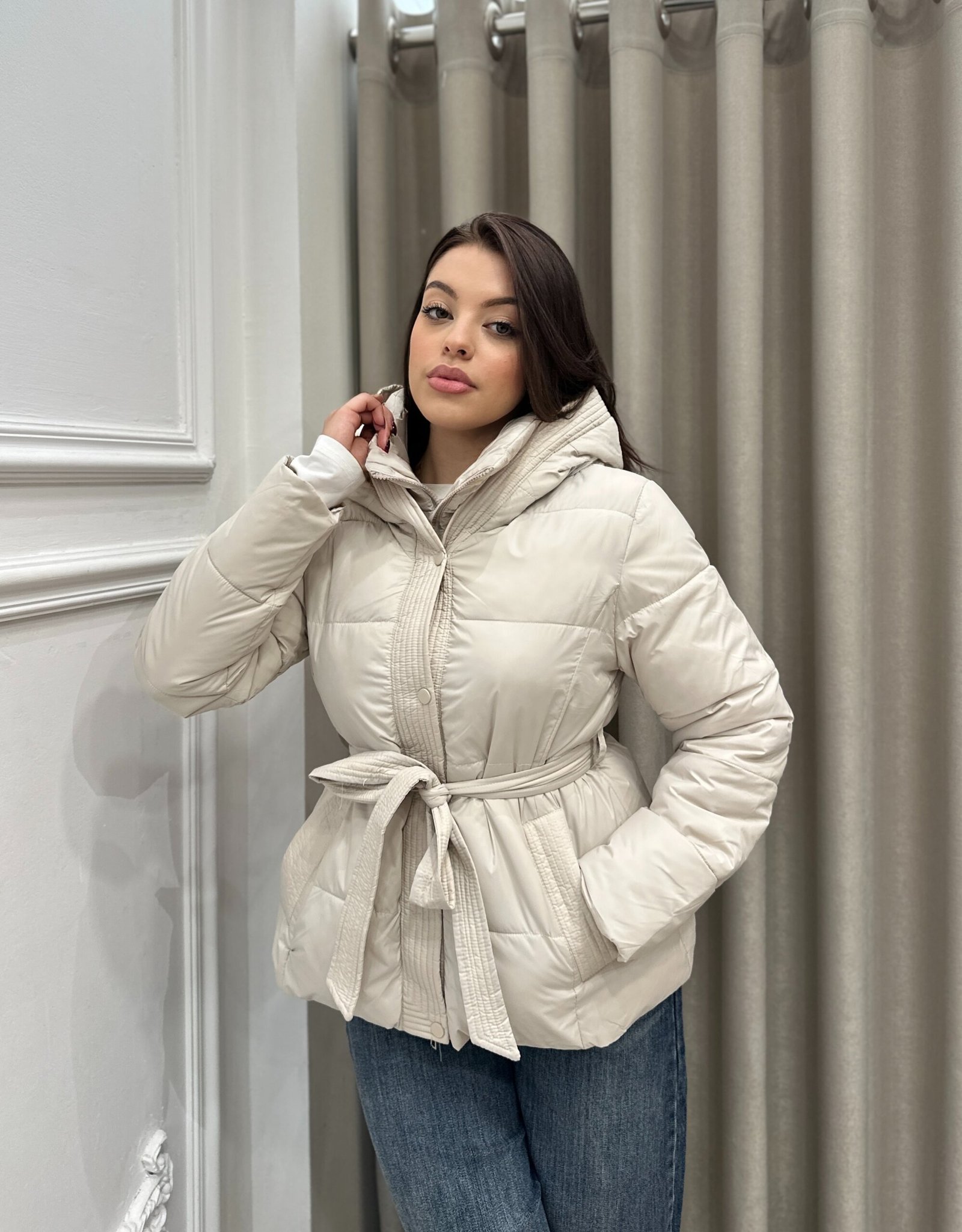 Xhup i ngrohte dhe praktik me dizajn modern, i shoqeruar me rrip ne bel per te theksuar silueten. Ka kapuc funksional dhe material te bute, ideal per ditet e ftohta te dimrit. Kombinohet lehte si me xhinse, ashtu edhe me veshje me elegante, duke ofruar rehati dhe stil ne cdo dalje.